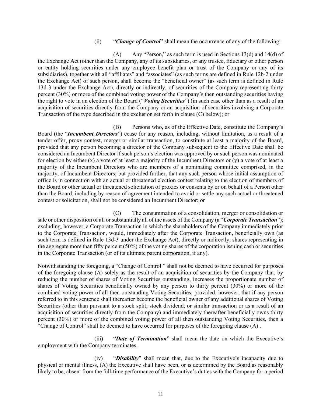 11 (ii) “Change of Control” shall mean the occurrence of any of the following: (A) Any “Person,” as such term is used in Sections 13(d) and 14(d) of the Exchange Act (other than the Company, any of its subsidiaries, or any trustee, fiduciary or other person or entity holding securities under any employee benefit plan or trust of the Company or any of its subsidiaries), together with all “affiliates” and “associates” (as such terms are defined in Rule 12b-2 under the Exchange Act) of such person, shall become the “beneficial owner” (as such term is defined in Rule 13d-3 under the Exchange Act), directly or indirectly, of securities of the Company representing thirty percent (30%) or more of the combined voting power of the Company’s then outstanding securities having the right to vote in an election of the Board (“Voting Securities”) (in such case other than as a result of an acquisition of securities directly from the Company or an acquisition of securities involving a Corporate Transaction of the type described in the exclusion set forth in clause (C) below); or (B) Persons who, as of the Effective Date, constitute the Company’s Board (the “Incumbent Directors”) cease for any reason, including, without limitation, as a result of a tender offer, proxy contest, merger or similar transaction, to constitute at least a majority of the Board, provided that any person becoming a director of the Company subsequent to the Effective Date shall be considered an Incumbent Director if such person’s election was approved by or such person was nominated for election by either (x) a vote of at least a majority of the Incumbent Directors or (y) a vote of at least a majority of the Incumbent Directors who are members of a nominating committee comprised, in the majority, of Incumbent Directors; but provided further, that any such person whose initial assumption of office is in connection with an actual or threatened election contest relating to the election of members of the Board or other actual or threatened solicitation of proxies or consents by or on behalf of a Person other than the Board, including by reason of agreement intended to avoid or settle any such actual or threatened contest or solicitation, shall not be considered an Incumbent Director; or (C) The consummation of a consolidation, merger or consolidation or sale or other disposition of all or substantially all of the assets of the Company (a “Corporate Transaction”); excluding, however, a Corporate Transaction in which the shareholders of the Company immediately prior to the Corporate Transaction, would, immediately after the Corporate Transaction, beneficially own (as such term is defined in Rule 13d-3 under the Exchange Act), directly or indirectly, shares representing in the aggregate more than fifty percent (50%) of the voting shares of the corporation issuing cash or securities in the Corporate Transaction (or of its ultimate parent corporation, if any). Notwithstanding the foregoing, a “Change of Control ” shall not be deemed to have occurred for purposes of the foregoing clause (A) solely as the result of an acquisition of securities by the Company that, by reducing the number of shares of Voting Securities outstanding, increases the proportionate number of shares of Voting Securities beneficially owned by any person to thirty percent (30%) or more of the combined voting power of all then outstanding Voting Securities; provided, however, that if any person referred to in this sentence shall thereafter become the beneficial owner of any additional shares of Voting Securities (other than pursuant to a stock split, stock dividend, or similar transaction or as a result of an acquisition of securities directly from the Company) and immediately thereafter beneficially owns thirty percent (30%) or more of the combined voting power of all then outstanding Voting Securities, then a “Change of Control” shall be deemed to have occurred for purposes of the foregoing clause (A) . (iii) “Date of Termination” shall mean the date on which the Executive’s employment with the Company terminates. (iv) “Disability” shall mean that, due to the Executive’s incapacity due to physical or mental illness, (A) the Executive shall have been, or is determined by the Board as reasonably likely to be, absent from the full-time performance of the Executive’s duties with the Company for a period