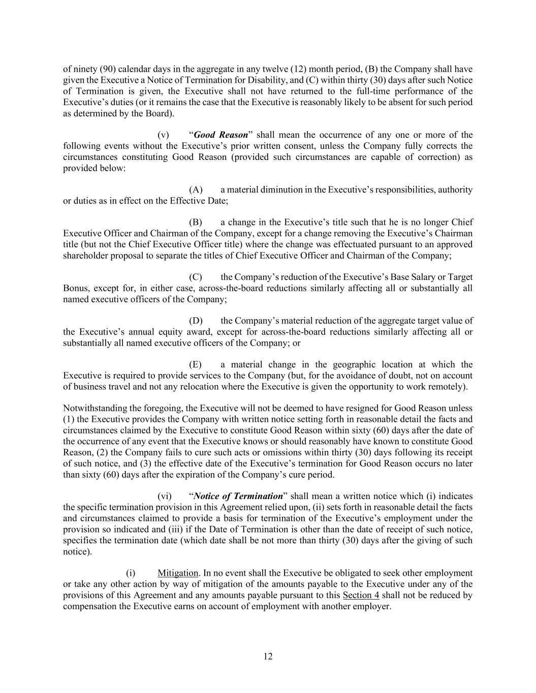 12 of ninety (90) calendar days in the aggregate in any twelve (12) month period, (B) the Company shall have given the Executive a Notice of Termination for Disability, and (C) within thirty (30) days after such Notice of Termination is given, the Executive shall not have returned to the full-time performance of the Executive’s duties (or it remains the case that the Executive is reasonably likely to be absent for such period as determined by the Board). (v) “Good Reason” shall mean the occurrence of any one or more of the following events without the Executive’s prior written consent, unless the Company fully corrects the circumstances constituting Good Reason (provided such circumstances are capable of correction) as provided below: (A) a material diminution in the Executive’s responsibilities, authority or duties as in effect on the Effective Date; (B) a change in the Executive’s title such that he is no longer Chief Executive Officer and Chairman of the Company, except for a change removing the Executive’s Chairman title (but not the Chief Executive Officer title) where the change was effectuated pursuant to an approved shareholder proposal to separate the titles of Chief Executive Officer and Chairman of the Company; (C) the Company’s reduction of the Executive’s Base Salary or Target Bonus, except for, in either case, across-the-board reductions similarly affecting all or substantially all named executive officers of the Company; (D) the Company’s material reduction of the aggregate target value of the Executive’s annual equity award, except for across-the-board reductions similarly affecting all or substantially all named executive officers of the Company; or (E) a material change in the geographic location at which the Executive is required to provide services to the Company (but, for the avoidance of doubt, not on account of business travel and not any relocation where the Executive is given the opportunity to work remotely). Notwithstanding the foregoing, the Executive will not be deemed to have resigned for Good Reason unless (1) the Executive provides the Company with written notice setting forth in reasonable detail the facts and circumstances claimed by the Executive to constitute Good Reason within sixty (60) days after the date of the occurrence of any event that the Executive knows or should reasonably have known to constitute Good Reason, (2) the Company fails to cure such acts or omissions within thirty (30) days following its receipt of such notice, and (3) the effective date of the Executive’s termination for Good Reason occurs no later than sixty (60) days after the expiration of the Company’s cure period. (vi) “Notice of Termination” shall mean a written notice which (i) indicates the specific termination provision in this Agreement relied upon, (ii) sets forth in reasonable detail the facts and circumstances claimed to provide a basis for termination of the Executive’s employment under the provision so indicated and (iii) if the Date of Termination is other than the date of receipt of such notice, specifies the termination date (which date shall be not more than thirty (30) days after the giving of such notice). (i) Mitigation. In no event shall the Executive be obligated to seek other employment or take any other action by way of mitigation of the amounts payable to the Executive under any of the provisions of this Agreement and any amounts payable pursuant to this Section 4 shall not be reduced by compensation the Executive earns on account of employment with another employer.