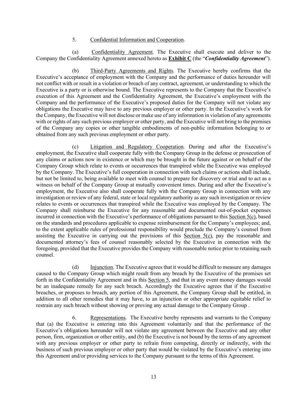 13 5. Confidential Information and Cooperation. (a) Confidentiality Agreement. The Executive shall execute and deliver to the Company the Confidentiality Agreement annexed hereto as Exhibit C (the “Confidentiality Agreement”). (b) Third-Party Agreements and Rights. The Executive hereby confirms that the Executive’s acceptance of employment with the Company and the performance of duties hereunder will not conflict with or result in a violation or breach of any contract, agreement, or understanding to which the Executive is a party or is otherwise bound. The Executive represents to the Company that the Executive’s execution of this Agreement and the Confidentiality Agreement, the Executive’s employment with the Company and the performance of the Executive’s proposed duties for the Company will not violate any obligations the Executive may have to any previous employer or other party. In the Executive’s work for the Company, the Executive will not disclose or make use of any information in violation of any agreements with or rights of any such previous employer or other party, and the Executive will not bring to the premises of the Company any copies or other tangible embodiments of non-public information belonging to or obtained from any such previous employment or other party. (c) Litigation and Regulatory Cooperation. During and after the Executive’s employment, the Executive shall cooperate fully with the Company Group in the defense or prosecution of any claims or actions now in existence or which may be brought in the future against or on behalf of the Company Group which relate to events or occurrences that transpired while the Executive was employed by the Company. The Executive’s full cooperation in connection with such claims or actions shall include, but not be limited to, being available to meet with counsel to prepare for discovery or trial and to act as a witness on behalf of the Company Group at mutually convenient times. During and after the Executive’s employment, the Executive also shall cooperate fully with the Company Group in connection with any investigation or review of any federal, state or local regulatory authority as any such investigation or review relates to events or occurrences that transpired while the Executive was employed by the Company. The Company shall reimburse the Executive for any reasonable and documented out-of-pocket expenses incurred in connection with the Executive’s performance of obligations pursuant to this Section 5(c), based on the standards and procedures applicable to expense reimbursement for the Company’s employees; and, to the extent applicable rules of professional responsibility would preclude the Company’s counsel from assisting the Executive in carrying out the provisions of this Section 5(c), pay the reasonable and documented attorney’s fees of counsel reasonably selected by the Executive in connection with the foregoing, provided that the Executive provides the Company with reasonable notice prior to retaining such counsel. (d) Injunction. The Executive agrees that it would be difficult to measure any damages caused to the Company Group which might result from any breach by the Executive of the promises set forth in the Confidentiality Agreement and in this Section 5, and that in any event money damages would be an inadequate remedy for any such breach. Accordingly the Executive agrees that if the Executive breaches, or proposes to breach, any portion of this Agreement, the Company Group shall be entitled, in addition to all other remedies that it may have, to an injunction or other appropriate equitable relief to restrain any such breach without showing or proving any actual damage to the Company Group . 6. Representations. The Executive hereby represents and warrants to the Company that (a) the Executive is entering into this Agreement voluntarily and that the performance of the Executive’s obligations hereunder will not violate any agreement between the Executive and any other person, firm, organization or other entity, and (b) the Executive is not bound by the terms of any agreement with any previous employer or other party to refrain from competing, directly or indirectly, with the business of such previous employer or other party that would be violated by the Executive’s entering into this Agreement and/or providing services to the Company pursuant to the terms of this Agreement.