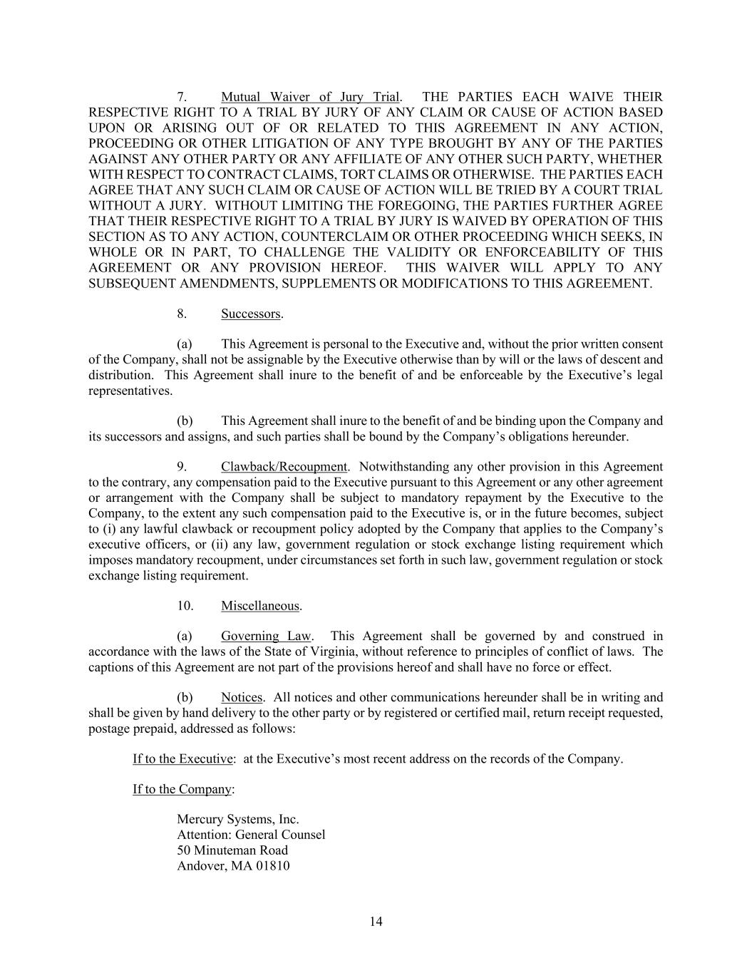 14 7. Mutual Waiver of Jury Trial. THE PARTIES EACH WAIVE THEIR RESPECTIVE RIGHT TO A TRIAL BY JURY OF ANY CLAIM OR CAUSE OF ACTION BASED UPON OR ARISING OUT OF OR RELATED TO THIS AGREEMENT IN ANY ACTION, PROCEEDING OR OTHER LITIGATION OF ANY TYPE BROUGHT BY ANY OF THE PARTIES AGAINST ANY OTHER PARTY OR ANY AFFILIATE OF ANY OTHER SUCH PARTY, WHETHER WITH RESPECT TO CONTRACT CLAIMS, TORT CLAIMS OR OTHERWISE. THE PARTIES EACH AGREE THAT ANY SUCH CLAIM OR CAUSE OF ACTION WILL BE TRIED BY A COURT TRIAL WITHOUT A JURY. WITHOUT LIMITING THE FOREGOING, THE PARTIES FURTHER AGREE THAT THEIR RESPECTIVE RIGHT TO A TRIAL BY JURY IS WAIVED BY OPERATION OF THIS SECTION AS TO ANY ACTION, COUNTERCLAIM OR OTHER PROCEEDING WHICH SEEKS, IN WHOLE OR IN PART, TO CHALLENGE THE VALIDITY OR ENFORCEABILITY OF THIS AGREEMENT OR ANY PROVISION HEREOF. THIS WAIVER WILL APPLY TO ANY SUBSEQUENT AMENDMENTS, SUPPLEMENTS OR MODIFICATIONS TO THIS AGREEMENT. 8. Successors. (a) This Agreement is personal to the Executive and, without the prior written consent of the Company, shall not be assignable by the Executive otherwise than by will or the laws of descent and distribution. This Agreement shall inure to the benefit of and be enforceable by the Executive’s legal representatives. (b) This Agreement shall inure to the benefit of and be binding upon the Company and its successors and assigns, and such parties shall be bound by the Company’s obligations hereunder. 9. Clawback/Recoupment. Notwithstanding any other provision in this Agreement to the contrary, any compensation paid to the Executive pursuant to this Agreement or any other agreement or arrangement with the Company shall be subject to mandatory repayment by the Executive to the Company, to the extent any such compensation paid to the Executive is, or in the future becomes, subject to (i) any lawful clawback or recoupment policy adopted by the Company that applies to the Company’s executive officers, or (ii) any law, government regulation or stock exchange listing requirement which imposes mandatory recoupment, under circumstances set forth in such law, government regulation or stock exchange listing requirement. 10. Miscellaneous. (a) Governing Law. This Agreement shall be governed by and construed in accordance with the laws of the State of Virginia, without reference to principles of conflict of laws. The captions of this Agreement are not part of the provisions hereof and shall have no force or effect. (b) Notices. All notices and other communications hereunder shall be in writing and shall be given by hand delivery to the other party or by registered or certified mail, return receipt requested, postage prepaid, addressed as follows: If to the Executive: at the Executive’s most recent address on the records of the Company. If to the Company: Mercury Systems, Inc. Attention: General Counsel 50 Minuteman Road Andover, MA 01810