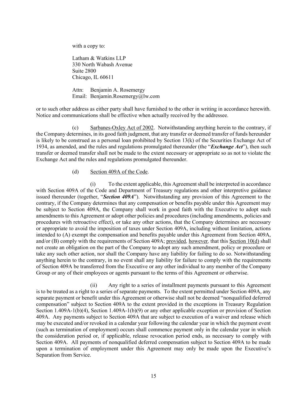 15 with a copy to: Latham & Watkins LLP 330 North Wabash Avenue Suite 2800 Chicago, IL 60611 Attn: Benjamin A. Rosemergy Email: Benjamin.Rosemergy@lw.com or to such other address as either party shall have furnished to the other in writing in accordance herewith. Notice and communications shall be effective when actually received by the addressee. (c) Sarbanes-Oxley Act of 2002. Notwithstanding anything herein to the contrary, if the Company determines, in its good faith judgment, that any transfer or deemed transfer of funds hereunder is likely to be construed as a personal loan prohibited by Section 13(k) of the Securities Exchange Act of 1934, as amended, and the rules and regulations promulgated thereunder (the “Exchange Act”), then such transfer or deemed transfer shall not be made to the extent necessary or appropriate so as not to violate the Exchange Act and the rules and regulations promulgated thereunder. (d) Section 409A of the Code. (i) To the extent applicable, this Agreement shall be interpreted in accordance with Section 409A of the Code and Department of Treasury regulations and other interpretive guidance issued thereunder (together, “Section 409A”). Notwithstanding any provision of this Agreement to the contrary, if the Company determines that any compensation or benefits payable under this Agreement may be subject to Section 409A, the Company shall work in good faith with the Executive to adopt such amendments to this Agreement or adopt other policies and procedures (including amendments, policies and procedures with retroactive effect), or take any other actions, that the Company determines are necessary or appropriate to avoid the imposition of taxes under Section 409A, including without limitation, actions intended to (A) exempt the compensation and benefits payable under this Agreement from Section 409A, and/or (B) comply with the requirements of Section 409A; provided, however, that this Section 10(d) shall not create an obligation on the part of the Company to adopt any such amendment, policy or procedure or take any such other action, nor shall the Company have any liability for failing to do so. Notwithstanding anything herein to the contrary, in no event shall any liability for failure to comply with the requirements of Section 409A be transferred from the Executive or any other individual to any member of the Company Group or any of their employees or agents pursuant to the terms of this Agreement or otherwise. (ii) Any right to a series of installment payments pursuant to this Agreement is to be treated as a right to a series of separate payments. To the extent permitted under Section 409A, any separate payment or benefit under this Agreement or otherwise shall not be deemed “nonqualified deferred compensation” subject to Section 409A to the extent provided in the exceptions in Treasury Regulation Section 1.409A-1(b)(4), Section 1.409A-1(b)(9) or any other applicable exception or provision of Section 409A. Any payments subject to Section 409A that are subject to execution of a waiver and release which may be executed and/or revoked in a calendar year following the calendar year in which the payment event (such as termination of employment) occurs shall commence payment only in the calendar year in which the consideration period or, if applicable, release revocation period ends, as necessary to comply with Section 409A. All payments of nonqualified deferred compensation subject to Section 409A to be made upon a termination of employment under this Agreement may only be made upon the Executive’s Separation from Service.