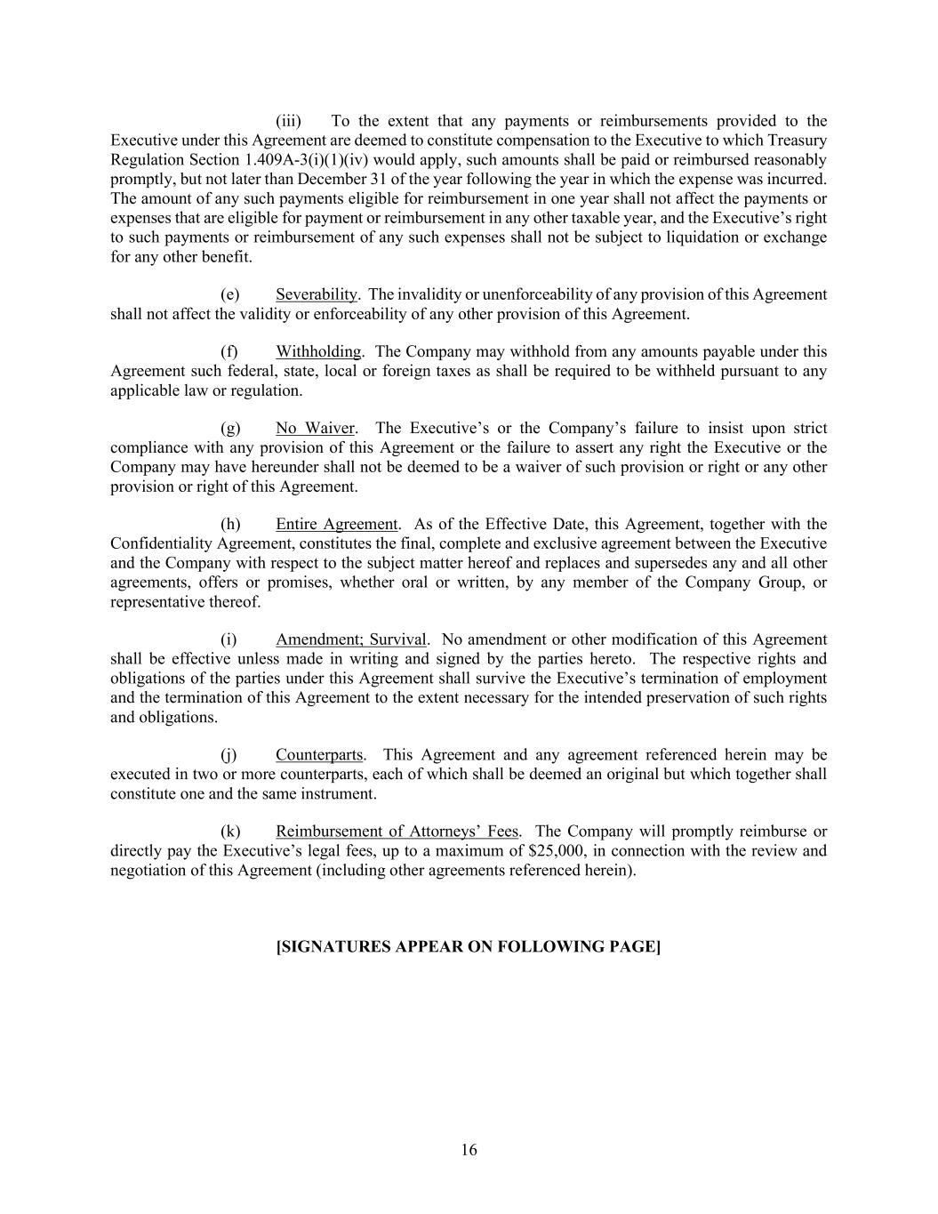 16 (iii) To the extent that any payments or reimbursements provided to the Executive under this Agreement are deemed to constitute compensation to the Executive to which Treasury Regulation Section 1.409A-3(i)(1)(iv) would apply, such amounts shall be paid or reimbursed reasonably promptly, but not later than December 31 of the year following the year in which the expense was incurred. The amount of any such payments eligible for reimbursement in one year shall not affect the payments or expenses that are eligible for payment or reimbursement in any other taxable year, and the Executive’s right to such payments or reimbursement of any such expenses shall not be subject to liquidation or exchange for any other benefit. (e) Severability. The invalidity or unenforceability of any provision of this Agreement shall not affect the validity or enforceability of any other provision of this Agreement. (f) Withholding. The Company may withhold from any amounts payable under this Agreement such federal, state, local or foreign taxes as shall be required to be withheld pursuant to any applicable law or regulation. (g) No Waiver. The Executive’s or the Company’s failure to insist upon strict compliance with any provision of this Agreement or the failure to assert any right the Executive or the Company may have hereunder shall not be deemed to be a waiver of such provision or right or any other provision or right of this Agreement. (h) Entire Agreement. As of the Effective Date, this Agreement, together with the Confidentiality Agreement, constitutes the final, complete and exclusive agreement between the Executive and the Company with respect to the subject matter hereof and replaces and supersedes any and all other agreements, offers or promises, whether oral or written, by any member of the Company Group, or representative thereof. (i) Amendment; Survival. No amendment or other modification of this Agreement shall be effective unless made in writing and signed by the parties hereto. The respective rights and obligations of the parties under this Agreement shall survive the Executive’s termination of employment and the termination of this Agreement to the extent necessary for the intended preservation of such rights and obligations. (j) Counterparts. This Agreement and any agreement referenced herein may be executed in two or more counterparts, each of which shall be deemed an original but which together shall constitute one and the same instrument. (k) Reimbursement of Attorneys’ Fees. The Company will promptly reimburse or directly pay the Executive’s legal fees, up to a maximum of $25,000, in connection with the review and negotiation of this Agreement (including other agreements referenced herein). [SIGNATURES APPEAR ON FOLLOWING PAGE]