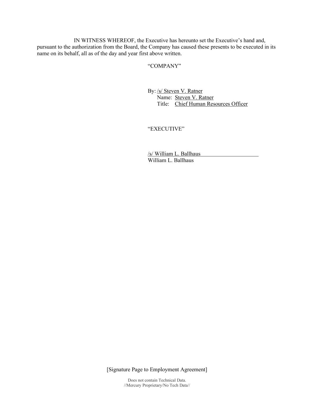 [Signature Page to Employment Agreement] Does not contain Technical Data. //Mercury Proprietary/No Tech Data// IN WITNESS WHEREOF, the Executive has hereunto set the Executive’s hand and, pursuant to the authorization from the Board, the Company has caused these presents to be executed in its name on its behalf, all as of the day and year first above written. “COMPANY” By: /s/ Steven V. Ratner Name: Steven V. Ratner Title: Chief Human Resources Officer “EXECUTIVE” /s/ William L. Ballhaus William L. Ballhaus