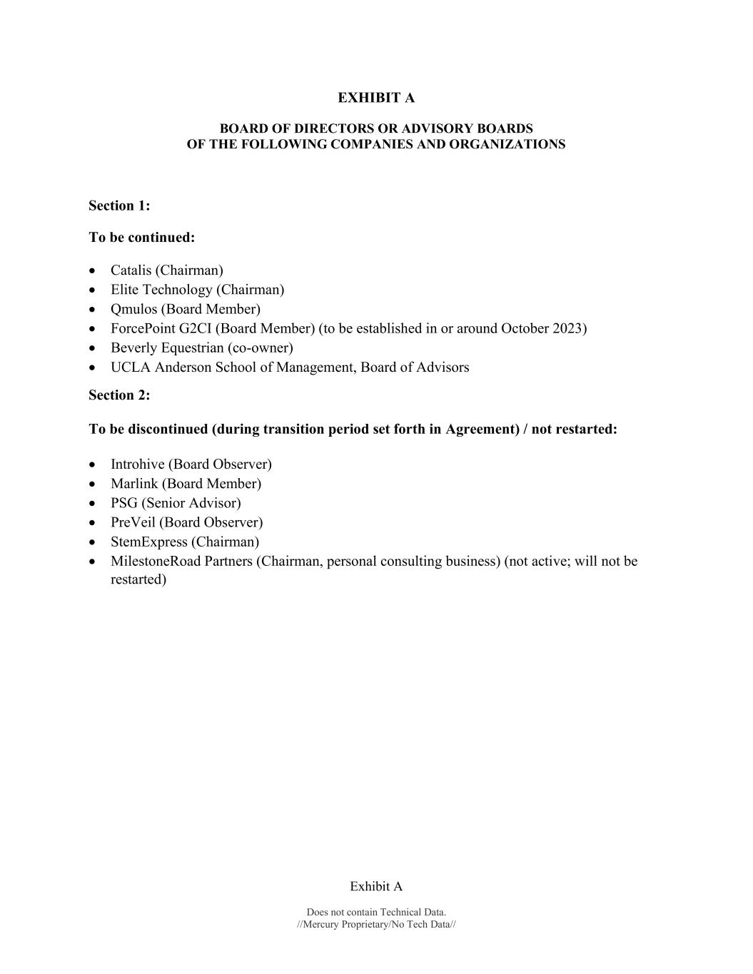 Exhibit A Does not contain Technical Data. //Mercury Proprietary/No Tech Data// EXHIBIT A BOARD OF DIRECTORS OR ADVISORY BOARDS OF THE FOLLOWING COMPANIES AND ORGANIZATIONS Section 1: To be continued:  Catalis (Chairman)  Elite Technology (Chairman)  Qmulos (Board Member)  ForcePoint G2CI (Board Member) (to be established in or around October 2023)  Beverly Equestrian (co-owner)  UCLA Anderson School of Management, Board of Advisors Section 2: To be discontinued (during transition period set forth in Agreement) / not restarted:  Introhive (Board Observer)  Marlink (Board Member)  PSG (Senior Advisor)  PreVeil (Board Observer)  StemExpress (Chairman)  MilestoneRoad Partners (Chairman, personal consulting business) (not active; will not be restarted)