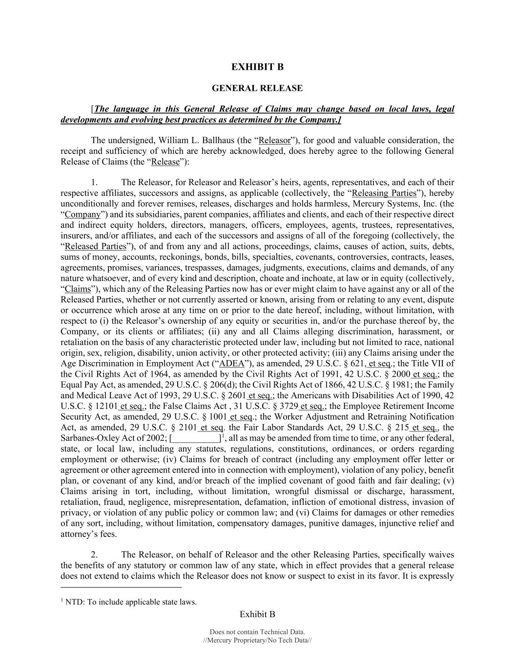 Exhibit B Does not contain Technical Data. //Mercury Proprietary/No Tech Data// EXHIBIT B GENERAL RELEASE [The language in this General Release of Claims may change based on local laws, legal developments and evolving best practices as determined by the Company.] The undersigned, William L. Ballhaus (the “Releasor”), for good and valuable consideration, the receipt and sufficiency of which are hereby acknowledged, does hereby agree to the following General Release of Claims (the “Release”): 1. The Releasor, for Releasor and Releasor’s heirs, agents, representatives, and each of their respective affiliates, successors and assigns, as applicable (collectively, the “Releasing Parties”), hereby unconditionally and forever remises, releases, discharges and holds harmless, Mercury Systems, Inc. (the “Company”) and its subsidiaries, parent companies, affiliates and clients, and each of their respective direct and indirect equity holders, directors, managers, officers, employees, agents, trustees, representatives, insurers, and/or affiliates, and each of the successors and assigns of all of the foregoing (collectively, the “Released Parties”), of and from any and all actions, proceedings, claims, causes of action, suits, debts, sums of money, accounts, reckonings, bonds, bills, specialties, covenants, controversies, contracts, leases, agreements, promises, variances, trespasses, damages, judgments, executions, claims and demands, of any nature whatsoever, and of every kind and description, choate and inchoate, at law or in equity (collectively, “Claims”), which any of the Releasing Parties now has or ever might claim to have against any or all of the Released Parties, whether or not currently asserted or known, arising from or relating to any event, dispute or occurrence which arose at any time on or prior to the date hereof, including, without limitation, with respect to (i) the Releasor’s ownership of any equity or securities in, and/or the purchase thereof by, the Company, or its clients or affiliates; (ii) any and all Claims alleging discrimination, harassment, or retaliation on the basis of any characteristic protected under law, including but not limited to race, national origin, sex, religion, disability, union activity, or other protected activity; (iii) any Claims arising under the Age Discrimination in Employment Act (“ADEA”), as amended, 29 U.S.C. § 621, et seq.; the Title VII of the Civil Rights Act of 1964, as amended by the Civil Rights Act of 1991, 42 U.S.C. § 2000 et seq.; the Equal Pay Act, as amended, 29 U.S.C. § 206(d); the Civil Rights Act of 1866, 42 U.S.C. § 1981; the Family and Medical Leave Act of 1993, 29 U.S.C. § 2601 et seq.; the Americans with Disabilities Act of 1990, 42 U.S.C. § 12101 et seq.; the False Claims Act , 31 U.S.C. § 3729 et seq.; the Employee Retirement Income Security Act, as amended, 29 U.S.C. § 1001 et seq.; the Worker Adjustment and Retraining Notification Act, as amended, 29 U.S.C. § 2101 et seq. the Fair Labor Standards Act, 29 U.S.C. § 215 et seq., the Sarbanes-Oxley Act of 2002; [__________]1, all as may be amended from time to time, or any other federal, state, or local law, including any statutes, regulations, constitutions, ordinances, or orders regarding employment or otherwise; (iv) Claims for breach of contract (including any employment offer letter or agreement or other agreement entered into in connection with employment), violation of any policy, benefit plan, or covenant of any kind, and/or breach of the implied covenant of good faith and fair dealing; (v) Claims arising in tort, including, without limitation, wrongful dismissal or discharge, harassment, retaliation, fraud, negligence, misrepresentation, defamation, infliction of emotional distress, invasion of privacy, or violation of any public policy or common law; and (vi) Claims for damages or other remedies of any sort, including, without limitation, compensatory damages, punitive damages, injunctive relief and attorney’s fees. 2. The Releasor, on behalf of Releasor and the other Releasing Parties, specifically waives the benefits of any statutory or common law of any state, which in effect provides that a general release does not extend to claims which the Releasor does not know or suspect to exist in its favor. It is expressly 1 NTD: To include applicable state laws.