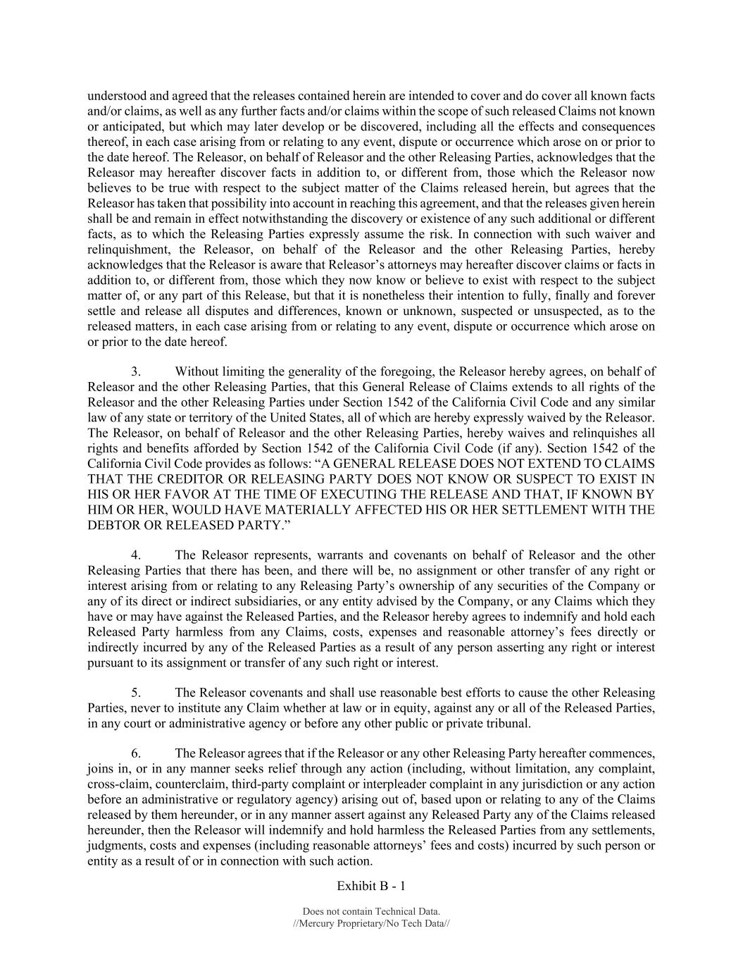 Exhibit B - 1 Does not contain Technical Data. //Mercury Proprietary/No Tech Data// understood and agreed that the releases contained herein are intended to cover and do cover all known facts and/or claims, as well as any further facts and/or claims within the scope of such released Claims not known or anticipated, but which may later develop or be discovered, including all the effects and consequences thereof, in each case arising from or relating to any event, dispute or occurrence which arose on or prior to the date hereof. The Releasor, on behalf of Releasor and the other Releasing Parties, acknowledges that the Releasor may hereafter discover facts in addition to, or different from, those which the Releasor now believes to be true with respect to the subject matter of the Claims released herein, but agrees that the Releasor has taken that possibility into account in reaching this agreement, and that the releases given herein shall be and remain in effect notwithstanding the discovery or existence of any such additional or different facts, as to which the Releasing Parties expressly assume the risk. In connection with such waiver and relinquishment, the Releasor, on behalf of the Releasor and the other Releasing Parties, hereby acknowledges that the Releasor is aware that Releasor’s attorneys may hereafter discover claims or facts in addition to, or different from, those which they now know or believe to exist with respect to the subject matter of, or any part of this Release, but that it is nonetheless their intention to fully, finally and forever settle and release all disputes and differences, known or unknown, suspected or unsuspected, as to the released matters, in each case arising from or relating to any event, dispute or occurrence which arose on or prior to the date hereof. 3. Without limiting the generality of the foregoing, the Releasor hereby agrees, on behalf of Releasor and the other Releasing Parties, that this General Release of Claims extends to all rights of the Releasor and the other Releasing Parties under Section 1542 of the California Civil Code and any similar law of any state or territory of the United States, all of which are hereby expressly waived by the Releasor. The Releasor, on behalf of Releasor and the other Releasing Parties, hereby waives and relinquishes all rights and benefits afforded by Section 1542 of the California Civil Code (if any). Section 1542 of the California Civil Code provides as follows: “A GENERAL RELEASE DOES NOT EXTEND TO CLAIMS THAT THE CREDITOR OR RELEASING PARTY DOES NOT KNOW OR SUSPECT TO EXIST IN HIS OR HER FAVOR AT THE TIME OF EXECUTING THE RELEASE AND THAT, IF KNOWN BY HIM OR HER, WOULD HAVE MATERIALLY AFFECTED HIS OR HER SETTLEMENT WITH THE DEBTOR OR RELEASED PARTY.” 4. The Releasor represents, warrants and covenants on behalf of Releasor and the other Releasing Parties that there has been, and there will be, no assignment or other transfer of any right or interest arising from or relating to any Releasing Party’s ownership of any securities of the Company or any of its direct or indirect subsidiaries, or any entity advised by the Company, or any Claims which they have or may have against the Released Parties, and the Releasor hereby agrees to indemnify and hold each Released Party harmless from any Claims, costs, expenses and reasonable attorney’s fees directly or indirectly incurred by any of the Released Parties as a result of any person asserting any right or interest pursuant to its assignment or transfer of any such right or interest. 5. The Releasor covenants and shall use reasonable best efforts to cause the other Releasing Parties, never to institute any Claim whether at law or in equity, against any or all of the Released Parties, in any court or administrative agency or before any other public or private tribunal. 6. The Releasor agrees that if the Releasor or any other Releasing Party hereafter commences, joins in, or in any manner seeks relief through any action (including, without limitation, any complaint, cross-claim, counterclaim, third-party complaint or interpleader complaint in any jurisdiction or any action before an administrative or regulatory agency) arising out of, based upon or relating to any of the Claims released by them hereunder, or in any manner assert against any Released Party any of the Claims released hereunder, then the Releasor will indemnify and hold harmless the Released Parties from any settlements, judgments, costs and expenses (including reasonable attorneys’ fees and costs) incurred by such person or entity as a result of or in connection with such action.