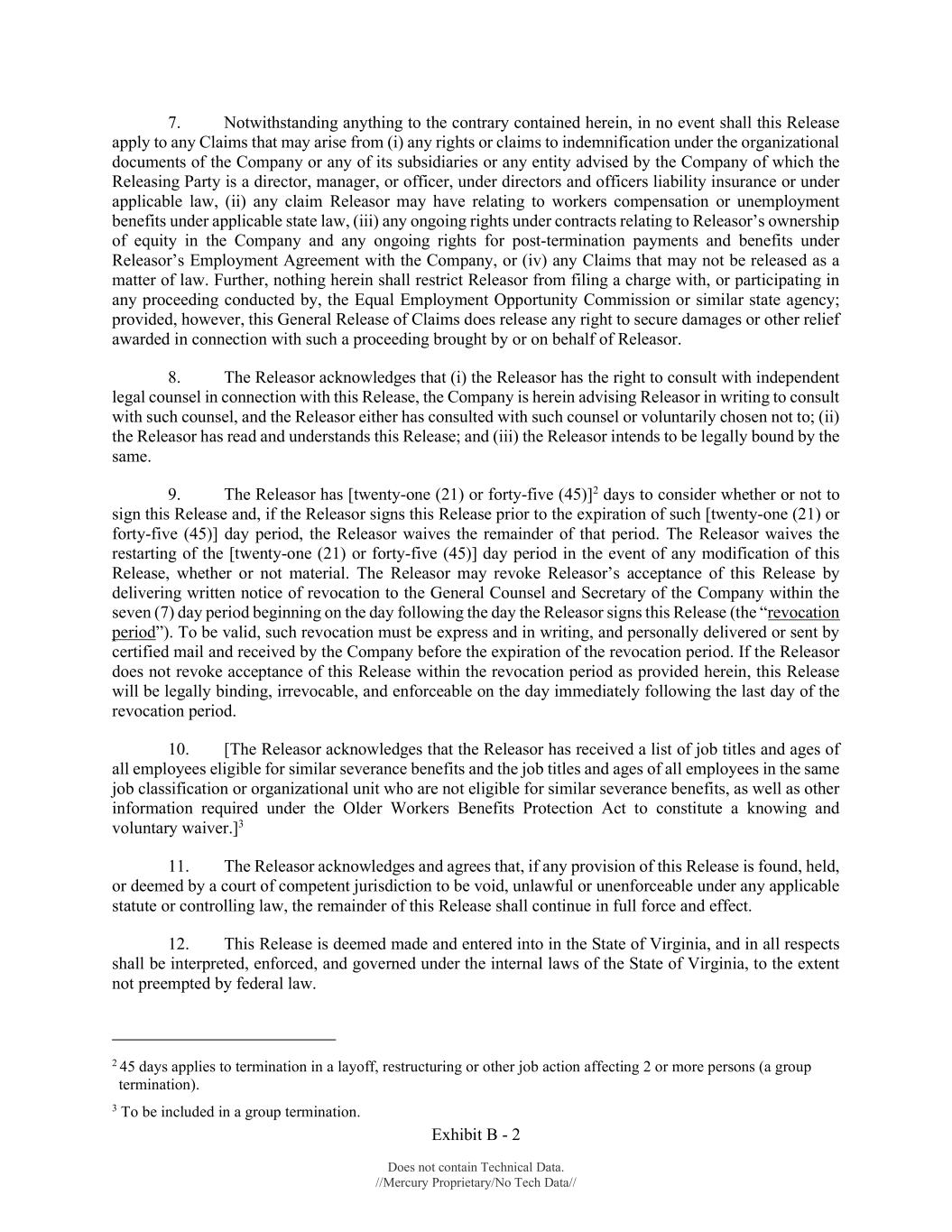 Exhibit B - 2 Does not contain Technical Data. //Mercury Proprietary/No Tech Data// 7. Notwithstanding anything to the contrary contained herein, in no event shall this Release apply to any Claims that may arise from (i) any rights or claims to indemnification under the organizational documents of the Company or any of its subsidiaries or any entity advised by the Company of which the Releasing Party is a director, manager, or officer, under directors and officers liability insurance or under applicable law, (ii) any claim Releasor may have relating to workers compensation or unemployment benefits under applicable state law, (iii) any ongoing rights under contracts relating to Releasor’s ownership of equity in the Company and any ongoing rights for post-termination payments and benefits under Releasor’s Employment Agreement with the Company, or (iv) any Claims that may not be released as a matter of law. Further, nothing herein shall restrict Releasor from filing a charge with, or participating in any proceeding conducted by, the Equal Employment Opportunity Commission or similar state agency; provided, however, this General Release of Claims does release any right to secure damages or other relief awarded in connection with such a proceeding brought by or on behalf of Releasor. 8. The Releasor acknowledges that (i) the Releasor has the right to consult with independent legal counsel in connection with this Release, the Company is herein advising Releasor in writing to consult with such counsel, and the Releasor either has consulted with such counsel or voluntarily chosen not to; (ii) the Releasor has read and understands this Release; and (iii) the Releasor intends to be legally bound by the same. 9. The Releasor has [twenty-one (21) or forty-five (45)]2 days to consider whether or not to sign this Release and, if the Releasor signs this Release prior to the expiration of such [twenty-one (21) or forty-five (45)] day period, the Releasor waives the remainder of that period. The Releasor waives the restarting of the [twenty-one (21) or forty-five (45)] day period in the event of any modification of this Release, whether or not material. The Releasor may revoke Releasor’s acceptance of this Release by delivering written notice of revocation to the General Counsel and Secretary of the Company within the seven (7) day period beginning on the day following the day the Releasor signs this Release (the “revocation period”). To be valid, such revocation must be express and in writing, and personally delivered or sent by certified mail and received by the Company before the expiration of the revocation period. If the Releasor does not revoke acceptance of this Release within the revocation period as provided herein, this Release will be legally binding, irrevocable, and enforceable on the day immediately following the last day of the revocation period. 10. [The Releasor acknowledges that the Releasor has received a list of job titles and ages of all employees eligible for similar severance benefits and the job titles and ages of all employees in the same job classification or organizational unit who are not eligible for similar severance benefits, as well as other information required under the Older Workers Benefits Protection Act to constitute a knowing and voluntary waiver.]3 11. The Releasor acknowledges and agrees that, if any provision of this Release is found, held, or deemed by a court of competent jurisdiction to be void, unlawful or unenforceable under any applicable statute or controlling law, the remainder of this Release shall continue in full force and effect. 12. This Release is deemed made and entered into in the State of Virginia, and in all respects shall be interpreted, enforced, and governed under the internal laws of the State of Virginia, to the extent not preempted by federal law. 2 45 days applies to termination in a layoff, restructuring or other job action affecting 2 or more persons (a group termination). 3 To be included in a group termination.
