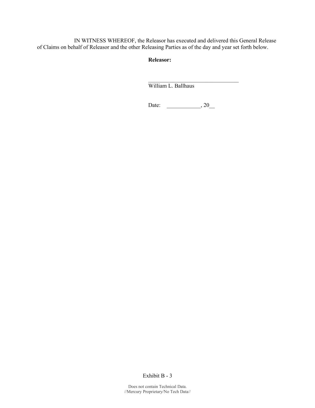 Exhibit B - 3 Does not contain Technical Data. //Mercury Proprietary/No Tech Data// IN WITNESS WHEREOF, the Releasor has executed and delivered this General Release of Claims on behalf of Releasor and the other Releasing Parties as of the day and year set forth below. Releasor: ________________________________ William L. Ballhaus Date: ____________, 20__