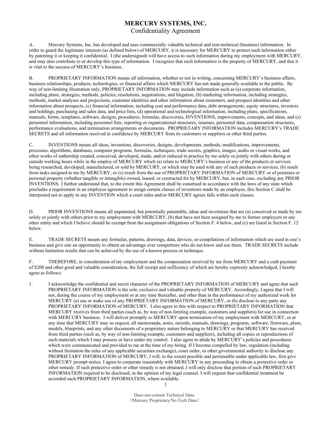 1 Does not contain Technical Data. //Mercury Proprietary/No Tech Data// MERCURY SYSTEMS, INC. Confidentiality Agreement A. Mercury Systems, Inc. has developed and uses commercially valuable technical and non-technical (business) information. In order to guard the legitimate interests (as defined below) of MERCURY, it is necessary for MERCURY to protect such information either by patenting it or keeping it confidential. I (the undersigned) will have access to such information during my employment with MERCURY, and may also contribute to or develop this type of information. I recognize that such information is the property of MERCURY, and that it is vital to the success of MERCURY’s business. B. PROPRIETARY INFORMATION means all information, whether or not in writing, concerning MERCURY’s business affairs, business relationships, products, technologies, or financial affairs which MERCURY has not made generally available to the public. By way of non-limiting illustration only, PROPRIETARY INFORMATION may include information such as (a) corporate information, including plans, strategies, methods, policies, resolutions, negotiations, and litigation, (b) marketing information, including strategies, methods, market analyses and projections, customer identities and other information about customers, and prospect identities and other information about prospects, (c) financial information, including cost and performance data, debt arrangements, equity structures, investors and holdings, purchasing and sales data, and price lists, (d) operational and technological information, including plans, specifications, manuals, forms, templates, software, designs, procedures, formulas, discoveries, INVENTIONS, improvements, concepts, and ideas, and (e) personnel information, including personnel lists, reporting or organizational structures, resumes, personnel data, compensation structures, performance evaluations, and termination arrangements or documents. PROPRIETARY INFORMATION includes MERCURY’s TRADE SECRETS and all information received in confidence by MERCURY from its customers or suppliers or other third parties. C. INVENTIONS means all ideas, inventions, discoveries, designs, developments, methods, modifications, improvements, processes, algorithms, databases, computer programs, formulas, techniques, trade secrets, graphics, images, audio or visual works, and other works of authorship created, conceived, developed, made, and/or reduced to practice by me solely or jointly with others during or outside working hours while in the employ of MERCURY which (a) relate to MERCURY’s business or any of the products or services being researched, developed, manufactured, or sold by MERCURY, or which may be used with any of such products or services, (b) result from tasks assigned to me by MERCURY, or (c) result from the use of PROPRIETARY INFORMATION of MERCURY or of premises or personal property (whether tangible or intangible) owned, leased, or contracted for by MERCURY, but, in each case, excluding any PRIOR INVENTIONS. I further understand that, to the extent this Agreement shall be construed in accordance with the laws of any state which precludes a requirement in an employee agreement to assign certain classes of inventions made by an employee, this Section C shall be interpreted not to apply to any INVENTION which a court rules and/or MERCURY agrees falls within such classes. D. PRIOR INVENTIONS means all unpatented, but potentially patentable, ideas and inventions that are (a) conceived or made by me solely or jointly with others prior to my employment with MERCURY, (b) that have not been assigned by me to former employers or any other entity and which I believe should be exempt from the assignment obligations of Section F. 4 below, and (c) are listed in Section F. 12 below. E. TRADE SECRETS means any formulas, patterns, drawings, data, devices, or compilations of information which are used in one’s business and give one an opportunity to obtain an advantage over competitors who do not know and use them. TRADE SECRETS include without limitation results that can be achieved by the use of a known process or technique. F. THEREFORE, in consideration of my employment and the compensation received by me from MERCURY and a cash payment of $200 and other good and valuable consideration, the full receipt and sufficiency of which are hereby expressly acknowledged, I hereby agree as follows: 1. I acknowledge the confidential and secret character of the PROPRIETARY INFORMATION of MERCURY and agree that such PROPRIETARY INFORMATION is the sole, exclusive and valuable property of MERCURY. Accordingly, I agree that I will not, during the course of my employment or at any time thereafter, and other than in the performance of my authorized work for MERCURY (a) use or make use of any PROPRIETARY INFORMATION of MERCURY, or (b) disclose to any party any PROPRIETARY INFORMATION of MERCURY. I also agree to this with respect to PROPRIETARY INFORMATION that MERCURY receives from third parties (such as, by way of non-limiting example, customers and suppliers) for use in connection with MERCURY business. I will deliver promptly to MERCURY upon termination of my employment with MERCURY, or at any time that MERCURY may so request, all memoranda, notes, records, manuals, drawings, programs, software, firmware, plans, models, blueprints, and any other documents of a proprietary nature belonging to MERCURY or that MERCURY has received from third parties (such as, by way of non-limiting example, customers and suppliers), including all copies or reproductions of such materials which I may possess or have under my control. I also agree to abide by MERCURY’s policies and procedures which were communicated and provided to me at the time of my hiring. If I become compelled by law, regulation (including without limitation the rules of any applicable securities exchange), court order, or other governmental authority to disclose a