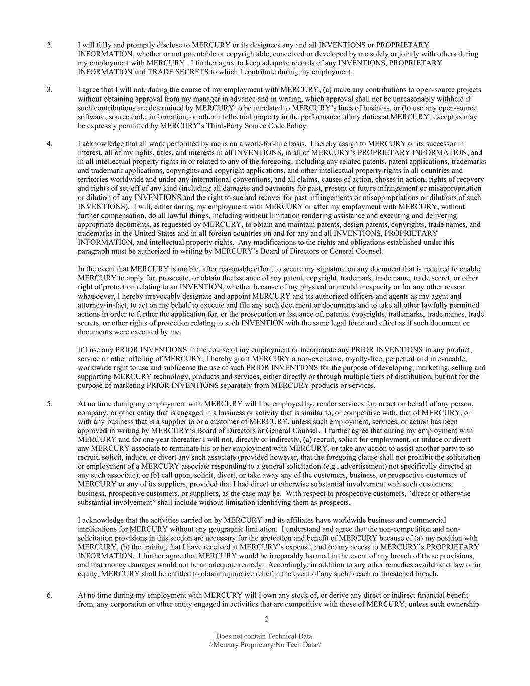 2 Does not contain Technical Data. //Mercury Proprietary/No Tech Data// 2. I will fully and promptly disclose to MERCURY or its designees any and all INVENTIONS or PROPRIETARY INFORMATION, whether or not patentable or copyrightable, conceived or developed by me solely or jointly with others during my employment with MERCURY. I further agree to keep adequate records of any INVENTIONS, PROPRIETARY INFORMATION and TRADE SECRETS to which I contribute during my employment. 3. I agree that I will not, during the course of my employment with MERCURY, (a) make any contributions to open-source projects without obtaining approval from my manager in advance and in writing, which approval shall not be unreasonably withheld if such contributions are determined by MERCURY to be unrelated to MERCURY’s lines of business, or (b) use any open-source software, source code, information, or other intellectual property in the performance of my duties at MERCURY, except as may be expressly permitted by MERCURY’s Third-Party Source Code Policy. 4. I acknowledge that all work performed by me is on a work-for-hire basis. I hereby assign to MERCURY or its successor in interest, all of my rights, titles, and interests in all INVENTIONS, in all of MERCURY’s PROPRIETARY INFORMATION, and in all intellectual property rights in or related to any of the foregoing, including any related patents, patent applications, trademarks and trademark applications, copyrights and copyright applications, and other intellectual property rights in all countries and territories worldwide and under any international conventions, and all claims, causes of action, choses in action, rights of recovery and rights of set-off of any kind (including all damages and payments for past, present or future infringement or misappropriation or dilution of any INVENTIONS and the right to sue and recover for past infringements or misappropriations or dilutions of such INVENTIONS). I will, either during my employment with MERCURY or after my employment with MERCURY, without further compensation, do all lawful things, including without limitation rendering assistance and executing and delivering appropriate documents, as requested by MERCURY, to obtain and maintain patents, design patents, copyrights, trade names, and trademarks in the United States and in all foreign countries on and for any and all INVENTIONS, PROPRIETARY INFORMATION, and intellectual property rights. Any modifications to the rights and obligations established under this paragraph must be authorized in writing by MERCURY’s Board of Directors or General Counsel. In the event that MERCURY is unable, after reasonable effort, to secure my signature on any document that is required to enable MERCURY to apply for, prosecute, or obtain the issuance of any patent, copyright, trademark, trade name, trade secret, or other right of protection relating to an INVENTION, whether because of my physical or mental incapacity or for any other reason whatsoever, I hereby irrevocably designate and appoint MERCURY and its authorized officers and agents as my agent and attorney-in-fact, to act on my behalf to execute and file any such document or documents and to take all other lawfully permitted actions in order to further the application for, or the prosecution or issuance of, patents, copyrights, trademarks, trade names, trade secrets, or other rights of protection relating to such INVENTION with the same legal force and effect as if such document or documents were executed by me. If I use any PRIOR INVENTIONS in the course of my employment or incorporate any PRIOR INVENTIONS in any product, service or other offering of MERCURY, I hereby grant MERCURY a non-exclusive, royalty-free, perpetual and irrevocable, worldwide right to use and sublicense the use of such PRIOR INVENTIONS for the purpose of developing, marketing, selling and supporting MERCURY technology, products and services, either directly or through multiple tiers of distribution, but not for the purpose of marketing PRIOR INVENTIONS separately from MERCURY products or services. 5. At no time during my employment with MERCURY will I be employed by, render services for, or act on behalf of any person, company, or other entity that is engaged in a business or activity that is similar to, or competitive with, that of MERCURY, or with any business that is a supplier to or a customer of MERCURY, unless such employment, services, or action has been approved in writing by MERCURY’s Board of Directors or General Counsel. I further agree that during my employment with MERCURY and for one year thereafter I will not, directly or indirectly, (a) recruit, solicit for employment, or induce or divert any MERCURY associate to terminate his or her employment with MERCURY, or take any action to assist another party to so recruit, solicit, induce, or divert any such associate (provided however, that the foregoing clause shall not prohibit the solicitation or employment of a MERCURY associate responding to a general solicitation (e.g., advertisement) not specifically directed at any such associate), or (b) call upon, solicit, divert, or take away any of the customers, business, or prospective customers of MERCURY or any of its suppliers, provided that I had direct or otherwise substantial involvement with such customers, business, prospective customers, or suppliers, as the case may be. With respect to prospective customers, “direct or otherwise substantial involvement” shall include without limitation identifying them as prospects. I acknowledge that the activities carried on by MERCURY and its affiliates have worldwide business and commercial implications for MERCURY without any geographic limitation. I understand and agree that the non-competition and non- solicitation provisions in this section are necessary for the protection and benefit of MERCURY because of (a) my position with MERCURY, (b) the training that I have received at MERCURY’s expe