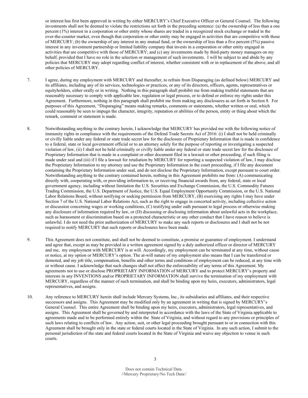 3 Does not contain Technical Data. //Mercury Proprietary/No Tech Data// or interest has first been approved in writing by either MERCURY’s Chief Executive Officer or General Counsel. The following investments shall not be deemed to violate the restrictions set forth in the preceding sentence: (a) the ownership of less than a one percent (1%) interest in a corporation or other entity whose shares are traded in a recognized stock exchange or traded in the over-the-counter market, even though that corporation or other entity may be engaged in activities that are competitive with those of MERCURY; (b) the ownership of any interest in any mutual fund, or the ownership of less than a five percent (5%) passive interest in any investment partnership or limited liability company that invests in a corporation or other entity engaged in activities that are competitive with those of MERCURY; and (c) any investments made by third-party money managers on my behalf, provided that I have no role in the selection or management of such investments. I will be subject to and abide by any policies that MERCURY may adopt regarding conflict of interest, whether consistent with or in replacement of the above, and all other policies of MERCURY. 7. I agree, during my employment with MERCURY and thereafter, to refrain from Disparaging (as defined below) MERCURY and its affiliates, including any of its services, technologies or practices, or any of its directors, officers, agents, representatives or equityholders, either orally or in writing. Nothing in this paragraph shall prohibit me from making truthful statements that are reasonably necessary to comply with applicable law, regulation or legal process, or to defend or enforce my rights under this Agreement. Furthermore, nothing in this paragraph shall prohibit me from making any disclosures as set forth in Section 8. For purposes of this Agreement, “Disparaging” means making remarks, comments or statements, whether written or oral, which could reasonably be seen to impugn the character, integrity, reputation or abilities of the person, entity or thing about which the remark, comment or statement is made. 8. Notwithstanding anything to the contrary herein, I acknowledge that MERCURY has provided me with the following notice of immunity rights in compliance with the requirements of the Defend Trade Secrets Act of 2016: (i) I shall not be held criminally or civilly liable under any federal or state trade secret law for the disclosure of Proprietary Information that is made in confidence to a federal, state or local government official or to an attorney solely for the purpose of reporting or investigating a suspected violation of law, (ii) I shall not be held criminally or civilly liable under any federal or state trade secret law for the disclosure of Proprietary Information that is made in a complaint or other document filed in a lawsuit or other proceeding, if such filing is made under seal and (iii) if I file a lawsuit for retaliation by MERCURY for reporting a suspected violation of law, I may disclose the Proprietary Information to my attorney and use the Proprietary Information in the court proceeding, if I file any document containing the Proprietary Information under seal, and do not disclose the Proprietary Information, except pursuant to court order. Notwithstanding anything to the contrary contained herein, nothing in this Agreement prohibits me from: (A) communicating directly with, cooperating with, or providing information to, or receiving financial awards from, any federal, state or local government agency, including without limitation the U.S. Securities and Exchange Commission, the U.S. Commodity Futures Trading Commission, the U.S. Department of Justice, the U.S. Equal Employment Opportunity Commission, or the U.S. National Labor Relations Board, without notifying or seeking permission from MERCURY, (B) exercising any rights I may have under Section 7 of the U.S. National Labor Relations Act, such as the right to engage in concerted activity, including collective action or discussion concerning wages or working conditions, (C) testifying under oath pursuant to legal process or otherwise making any disclosure of information required by law, or (D) discussing or disclosing information about unlawful acts in the workplace, such as harassment or discrimination based on a protected characteristic or any other conduct that I have reason to believe is unlawful. I do not need the prior authorization of MERCURY to make any such reports or disclosures and I shall not be not required to notify MERCURY that such reports or disclosures have been made. 9. This Agreement does not constitute, and shall not be deemed to constitute, a promise or guarantee of employment. I understand and agree that, except as may be provided in a written agreement signed by a duly authorized officer or director of MERCURY and me, my employment with MERCURY is at will. Accordingly, my employment can be terminated at any time, without cause or notice, at my option or MERCURY’s option. The at-will nature of my employment also means that I can be transferred or demoted, and my job title, compensation, benefits and other terms and conditions of employment can be reduced, at any time with or without cause. I acknowledge that such changes shall not affect the enforceability of any terms of this Agreement. My agreements not to use or disclose PROPRIETARY INFORMATION of MERCURY and to protect MERCURY’s property and interests in any INVENTIONS and/or PROPRIETARY INFORMATION shall survive the termination of my employment with MERCURY, regardless of the manner of such termination, and shall be binding upon my heirs, executors, administrators, legal representatives, and assigns. 10. Any reference to MERCURY herein shall include Mercury Systems, Inc., its subsidiaries and affiliates, and their respective successors and assigns. This Agreement may be modified only by an agreement in writ