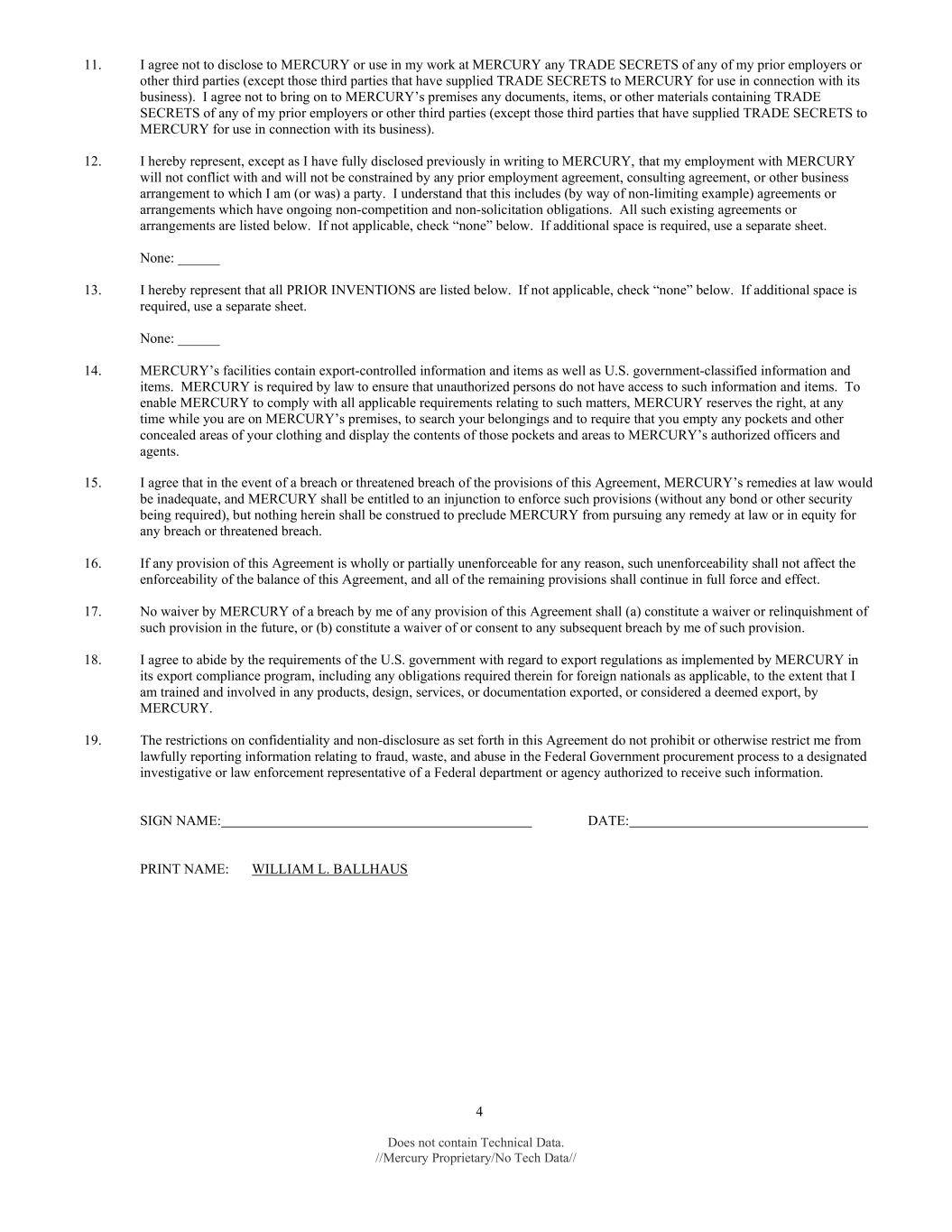 4 Does not contain Technical Data. //Mercury Proprietary/No Tech Data// 11. I agree not to disclose to MERCURY or use in my work at MERCURY any TRADE SECRETS of any of my prior employers or other third parties (except those third parties that have supplied TRADE SECRETS to MERCURY for use in connection with its business). I agree not to bring on to MERCURY’s premises any documents, items, or other materials containing TRADE SECRETS of any of my prior employers or other third parties (except those third parties that have supplied TRADE SECRETS to MERCURY for use in connection with its business). 12. I hereby represent, except as I have fully disclosed previously in writing to MERCURY, that my employment with MERCURY will not conflict with and will not be constrained by any prior employment agreement, consulting agreement, or other business arrangement to which I am (or was) a party. I understand that this includes (by way of non-limiting example) agreements or arrangements which have ongoing non-competition and non-solicitation obligations. All such existing agreements or arrangements are listed below. If not applicable, check “none” below. If additional space is required, use a separate sheet. None: ______ 13. I hereby represent that all PRIOR INVENTIONS are listed below. If not applicable, check “none” below. If additional space is required, use a separate sheet. None: ______ 14. MERCURY’s facilities contain export-controlled information and items as well as U.S. government-classified information and items. MERCURY is required by law to ensure that unauthorized persons do not have access to such information and items. To enable MERCURY to comply with all applicable requirements relating to such matters, MERCURY reserves the right, at any time while you are on MERCURY’s premises, to search your belongings and to require that you empty any pockets and other concealed areas of your clothing and display the contents of those pockets and areas to MERCURY’s authorized officers and agents. 15. I agree that in the event of a breach or threatened breach of the provisions of this Agreement, MERCURY’s remedies at law would be inadequate, and MERCURY shall be entitled to an injunction to enforce such provisions (without any bond or other security being required), but nothing herein shall be construed to preclude MERCURY from pursuing any remedy at law or in equity for any breach or threatened breach. 16. If any provision of this Agreement is wholly or partially unenforceable for any reason, such unenforceability shall not affect the enforceability of the balance of this Agreement, and all of the remaining provisions shall continue in full force and effect. 17. No waiver by MERCURY of a breach by me of any provision of this Agreement shall (a) constitute a waiver or relinquishment of such provision in the future, or (b) constitute a waiver of or consent to any subsequent breach by me of such provision. 18. I agree to abide by the requirements of the U.S. government with regard to export regulations as implemented by MERCURY in its export compliance program, including any obligations required therein for foreign nationals as applicable, to the extent that I am trained and involved in any products, design, services, or documentation exported, or considered a deemed export, by MERCURY. 19. The restrictions on confidentiality and non-disclosure as set forth in this Agreement do not prohibit or otherwise restrict me from lawfully reporting information relating to fraud, waste, and abuse in the Federal Government procurement process to a designated investigative or law enforcement representative of a Federal department or agency authorized to receive such information. SIGN NAME: DATE: PRINT NAME: WILLIAM L. BALLHAUS
