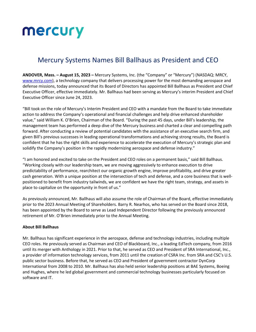Mercury Systems Names Bill Ballhaus as President and CEO ANDOVER, Mass. – August 15, 2023 – Mercury Systems, Inc. (the “Company” or “Mercury”) (NASDAQ: MRCY, www.mrcy.com), a technology company that delivers processing power for the most demanding aerospace and defense missions, today announced that its Board of Directors has appointed Bill Ballhaus as President and Chief Executive Officer, effective immediately. Mr. Ballhaus had been serving as Mercury’s interim President and Chief Executive Officer since June 24, 2023. “Bill took on the role of Mercury’s Interim President and CEO with a mandate from the Board to take immediate action to address the Company’s operational and financial challenges and help drive enhanced shareholder value,” said William K. O’Brien, Chairman of the Board. “During the past 45 days, under Bill’s leadership, the management team has performed a deep dive of the Mercury business and charted a clear and compelling path forward. After conducting a review of potential candidates with the assistance of an executive search firm, and given Bill’s previous successes in leading operational transformations and achieving strong results, the Board is confident that he has the right skills and experience to accelerate the execution of Mercury’s strategic plan and solidify the Company’s position in the rapidly modernizing aerospace and defense industry.” “I am honored and excited to take on the President and CEO roles on a permanent basis,” said Bill Ballhaus. “Working closely with our leadership team, we are moving aggressively to enhance execution to drive predictability of performance, rearchitect our organic growth engine, improve profitability, and drive greater cash generation. With a unique position at the intersection of tech and defense, and a core business that is well- positioned to benefit from industry tailwinds, we are confident we have the right team, strategy, and assets in place to capitalize on the opportunity in front of us.” As previously announced, Mr. Ballhaus will also assume the role of Chairman of the Board, effective immediately prior to the 2023 Annual Meeting of Shareholders. Barry R. Nearhos, who has served on the Board since 2018, has been appointed by the Board to serve as Lead Independent Director following the previously announced retirement of Mr. O’Brien immediately prior to the Annual Meeting. About Bill Ballhaus Mr. Ballhaus has significant experience in the aerospace, defense and technology industries, including multiple CEO roles. He previously served as Chairman and CEO of Blackboard, Inc., a leading EdTech company, from 2016 until its merger with Anthology in 2021. Prior to that, he served as CEO and President of SRA International, Inc., a provider of information technology services, from 2011 until the creation of CSRA Inc. from SRA and CSC’s U.S. public sector business. Before that, he served as CEO and President of government contractor DynCorp International from 2008 to 2010. Mr. Ballhaus has also held senior leadership positions at BAE Systems, Boeing and Hughes, where he led global government and commercial technology businesses particularly focused on software and IT.