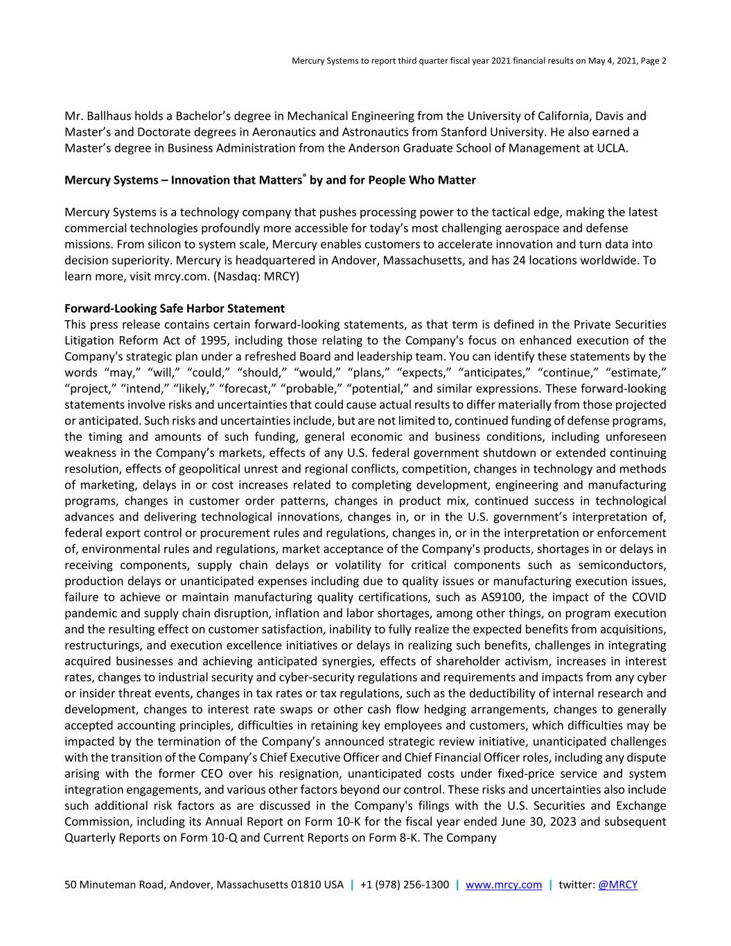 Mercury Systems to report third quarter fiscal year 2021 financial results on May 4, 2021, Page 2 50 Minuteman Road, Andover, Massachusetts 01810 USA | +1 (978) 256-1300 | www.mrcy.com | twitter: @MRCY Mr. Ballhaus holds a Bachelor’s degree in Mechanical Engineering from the University of California, Davis and Master’s and Doctorate degrees in Aeronautics and Astronautics from Stanford University. He also earned a Master’s degree in Business Administration from the Anderson Graduate School of Management at UCLA. Mercury Systems – Innovation that Matters® by and for People Who Matter Mercury Systems is a technology company that pushes processing power to the tactical edge, making the latest commercial technologies profoundly more accessible for today’s most challenging aerospace and defense missions. From silicon to system scale, Mercury enables customers to accelerate innovation and turn data into decision superiority. Mercury is headquartered in Andover, Massachusetts, and has 24 locations worldwide. To learn more, visit mrcy.com. (Nasdaq: MRCY) Forward-Looking Safe Harbor Statement This press release contains certain forward-looking statements, as that term is defined in the Private Securities Litigation Reform Act of 1995, including those relating to the Company's focus on enhanced execution of the Company's strategic plan under a refreshed Board and leadership team. You can identify these statements by the words “may,” “will,” “could,” “should,” “would,” “plans,” “expects,” “anticipates,” “continue,” “estimate,” “project,” “intend,” “likely,” “forecast,” “probable,” “potential,” and similar expressions. These forward-looking statements involve risks and uncertainties that could cause actual results to differ materially from those projected or anticipated. Such risks and uncertainties include, but are not limited to, continued funding of defense programs, the timing and amounts of such funding, general economic and business conditions, including unforeseen weakness in the Company’s markets, effects of any U.S. federal government shutdown or extended continuing resolution, effects of geopolitical unrest and regional conflicts, competition, changes in technology and methods of marketing, delays in or cost increases related to completing development, engineering and manufacturing programs, changes in customer order patterns, changes in product mix, continued success in technological advances and delivering technological innovations, changes in, or in the U.S. government’s interpretation of, federal export control or procurement rules and regulations, changes in, or in the interpretation or enforcement of, environmental rules and regulations, market acceptance of the Company's products, shortages in or delays in receiving components, supply chain delays or volatility for critical components such as semiconductors, production delays or unanticipated expenses including due to quality issues or manufacturing execution issues, failure to achieve or maintain manufacturing quality certifications, such as AS9100, the impact of the COVID pandemic and supply chain disruption, inflation and labor shortages, among other things, on program execution and the resulting effect on customer satisfaction, inability to fully realize the expected benefits from acquisitions, restructurings, and execution excellence initiatives or delays in realizing such benefits, challenges in integrating acquired businesses and achieving anticipated synergies, effects of shareholder activism, increases in interest rates, changes to industrial security and cyber-security regulations and requirements and impacts from any cyber or insider threat events, changes in tax rates or tax regulations, such as the deductibility of internal research and development, changes to interest rate swaps or other cash flow hedging arrangements, changes to generally accepted accounting principles, difficulties in retaining key employees and customers, which difficulties may be impacted by the termination of the Company’s announced strategic review initiative, unanticipated challenges with the transition of the Company’s Chief Executive Officer and Chief Financial Officer roles, including any dispute arising with the former CEO over his resignation, unanticipated costs under fixed-price service and system integration engagements, and various other factors beyond our control. These risks and uncertainties also include such additional risk factors as are discussed in the Company's filings with the U.S. Securities and Exchange Commission, including its Annual Report on Form 10-K for the fiscal year ended June 30, 2023 and subsequent Quarterly Reports on Form 10-Q and Current Reports on Form 8-K. The Company