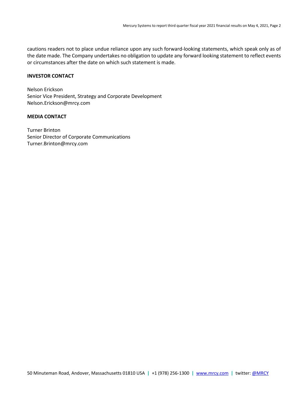 Mercury Systems to report third quarter fiscal year 2021 financial results on May 4, 2021, Page 2 50 Minuteman Road, Andover, Massachusetts 01810 USA | +1 (978) 256-1300 | www.mrcy.com | twitter: @MRCY cautions readers not to place undue reliance upon any such forward-looking statements, which speak only as of the date made. The Company undertakes no obligation to update any forward looking statement to reflect events or circumstances after the date on which such statement is made. INVESTOR CONTACT Nelson Erickson Senior Vice President, Strategy and Corporate Development Nelson.Erickson@mrcy.com MEDIA CONTACT Turner Brinton Senior Director of Corporate Communications Turner.Brinton@mrcy.com