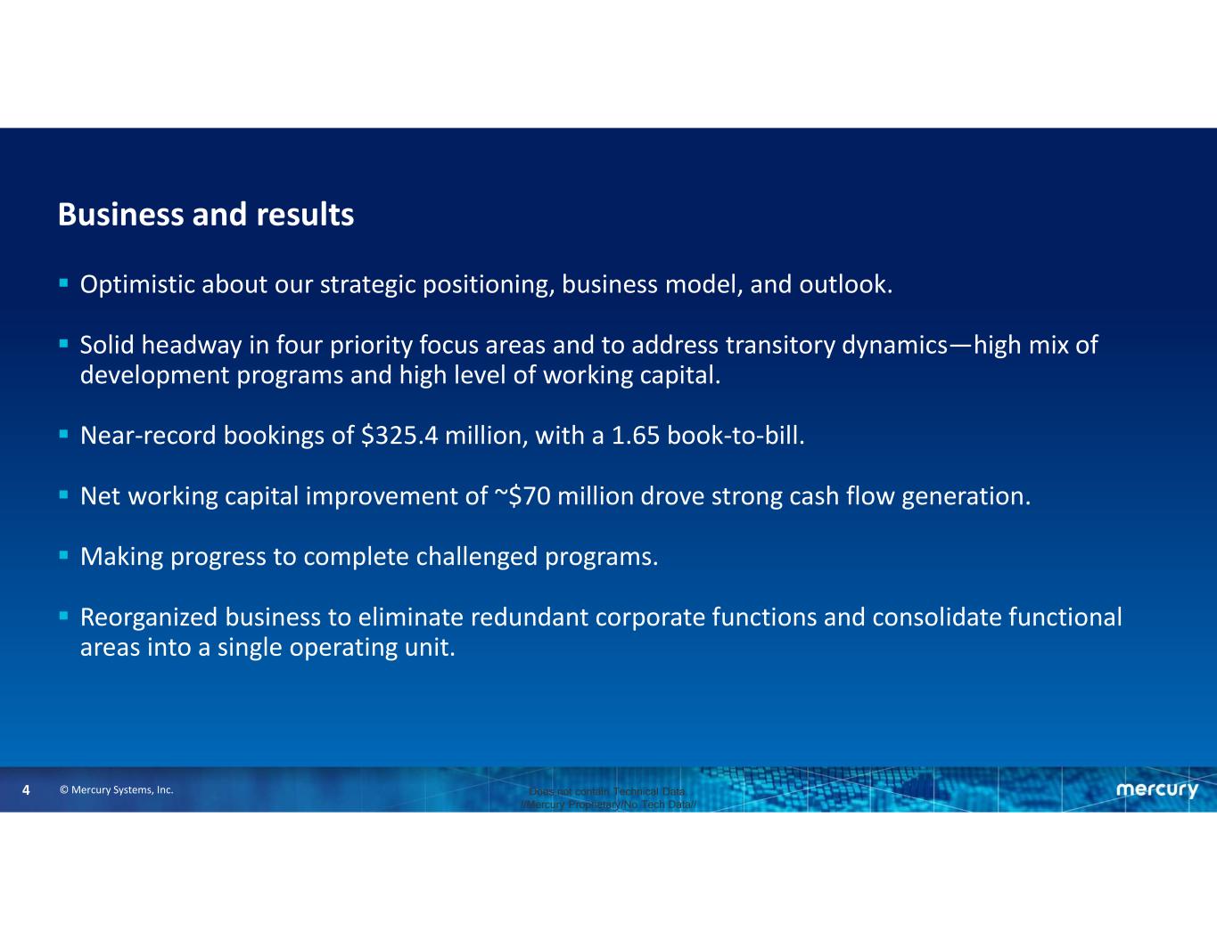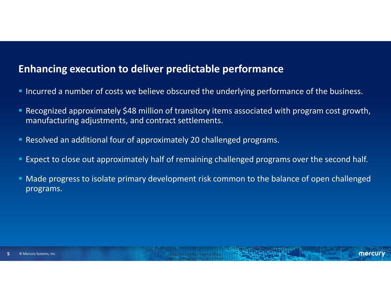 © Mercury Systems, Inc.4 Does not contain Technical Data. //Mercury Proprietary/No Tech Data// Business and results  Optimistic about our strategic positioning, business model, and outlook.  Solid headway in four priority focus areas and to address transitory dynamics—high mix of development programs and high level of working capital.  Near-record bookings of $325.4 million, with a 1.65 book-to-bill.  Net working capital improvement of ~$70 million drove strong cash flow generation.  Making progress to complete challenged programs.  Reorganized business to eliminate redundant corporate functions and consolidate functional areas into a single operating unit.