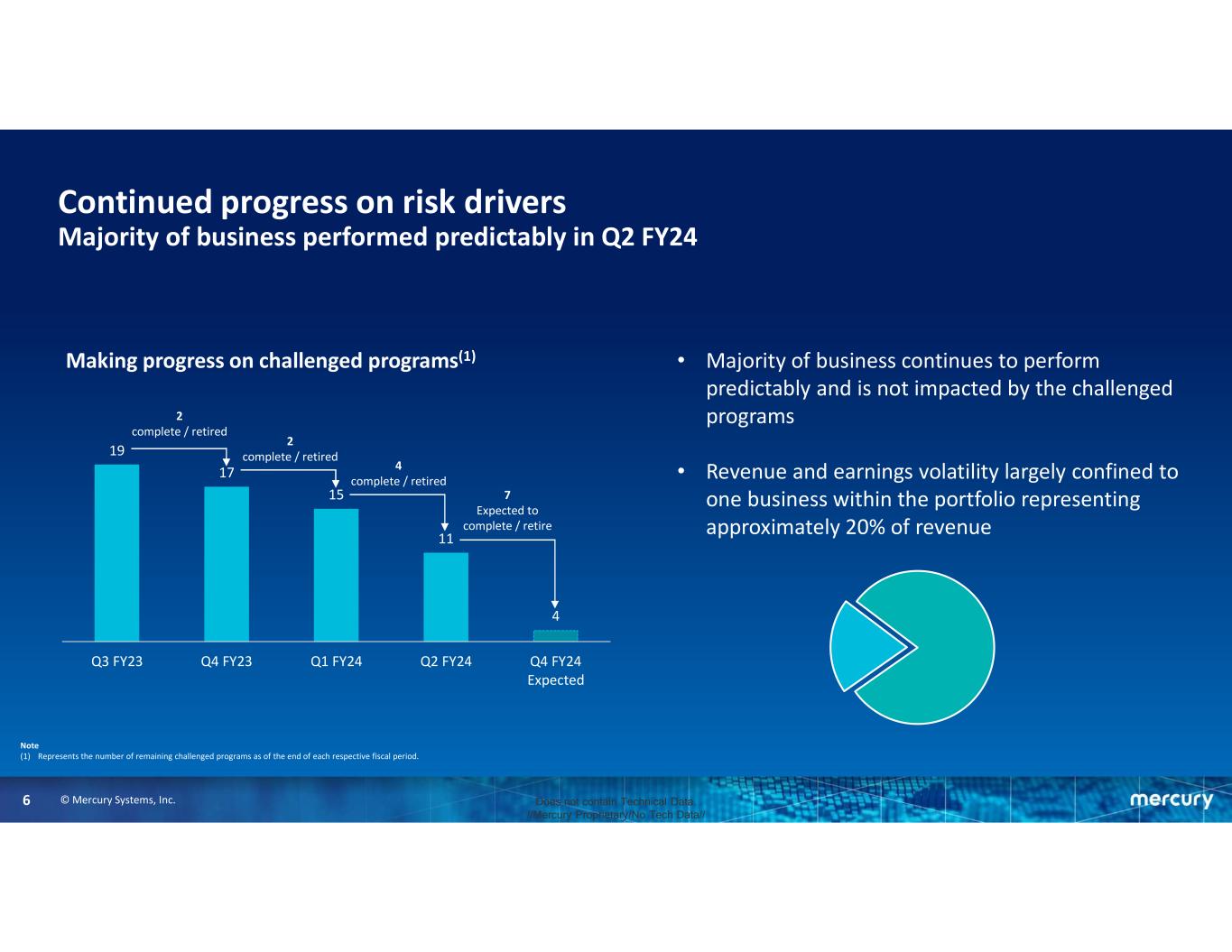 © Mercury Systems, Inc.5 Does not contain Technical Data. //Mercury Proprietary/No Tech Data// Enhancing execution to deliver predictable performance  Incurred a number of costs we believe obscured the underlying performance of the business.  Recognized approximately $48 million of transitory items associated with program cost growth, manufacturing adjustments, and contract settlements.  Resolved an additional four of approximately 20 challenged programs.  Expect to close out approximately half of remaining challenged programs over the second half.  Made progress to isolate primary development risk common to the balance of open challenged programs.