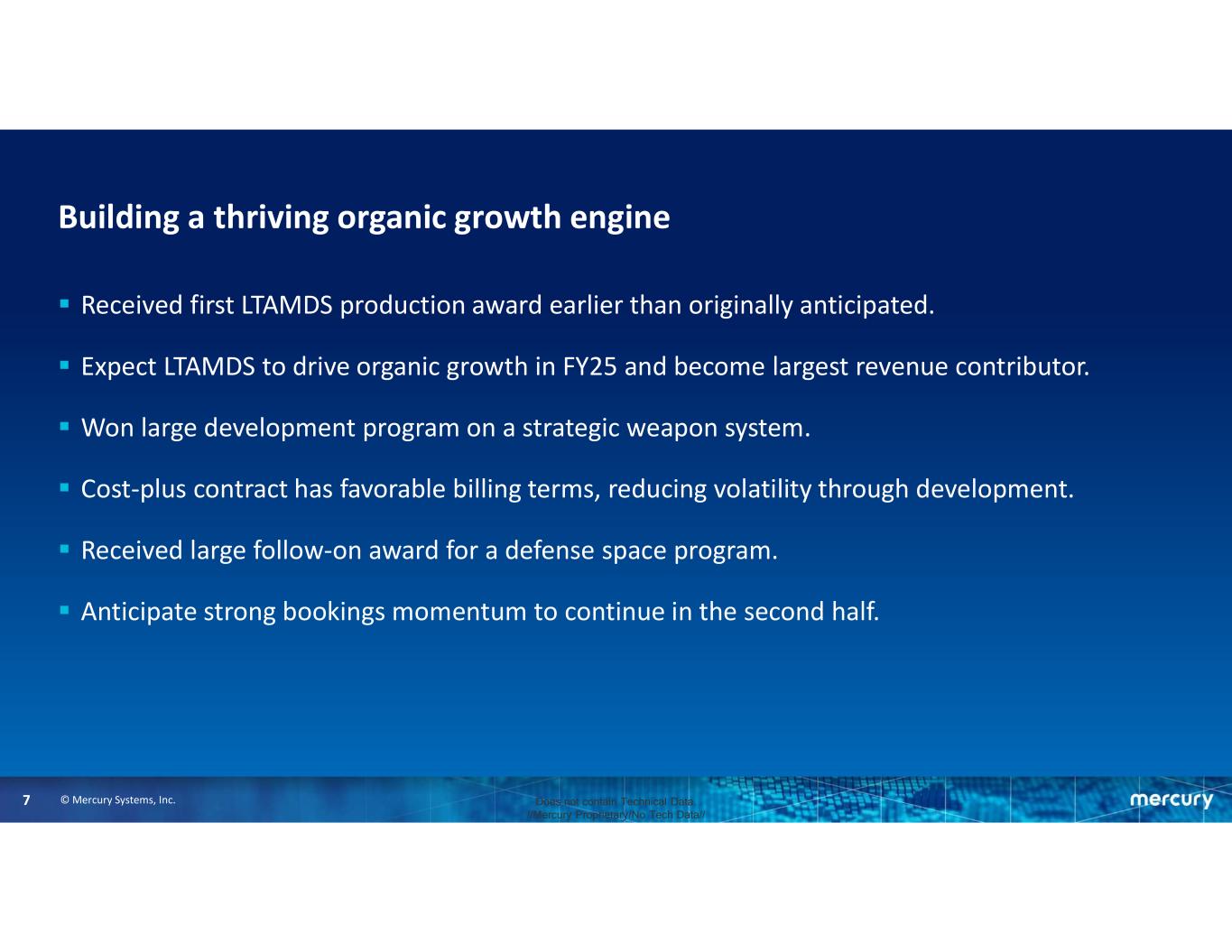 © Mercury Systems, Inc.7 Does not contain Technical Data. //Mercury Proprietary/No Tech Data// Building a thriving organic growth engine  Received first LTAMDS production award earlier than originally anticipated.  Expect LTAMDS to drive organic growth in FY25 and become largest revenue contributor.  Won large development program on a strategic weapon system.  Cost-plus contract has favorable billing terms, reducing volatility through development.  Received large follow-on award for a defense space program.  Anticipate strong bookings momentum to continue in the second half.