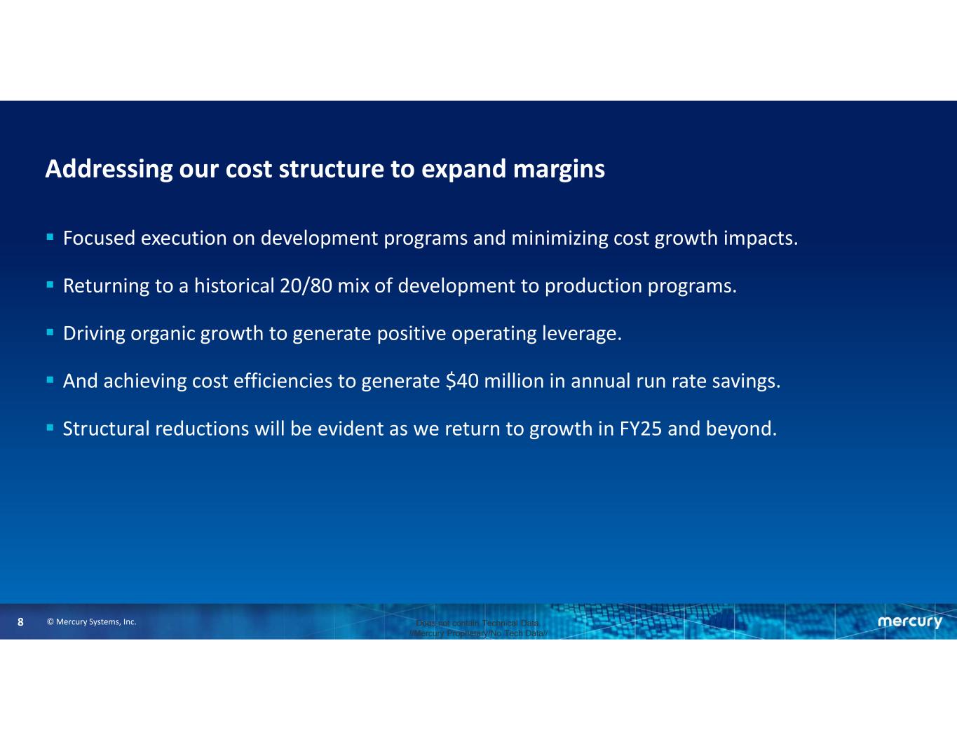 © Mercury Systems, Inc.8 Does not contain Technical Data. //Mercury Proprietary/No Tech Data// Addressing our cost structure to expand margins  Focused execution on development programs and minimizing cost growth impacts.  Returning to a historical 20/80 mix of development to production programs.  Driving organic growth to generate positive operating leverage.  And achieving cost efficiencies to generate $40 million in annual run rate savings.  Structural reductions will be evident as we return to growth in FY25 and beyond.