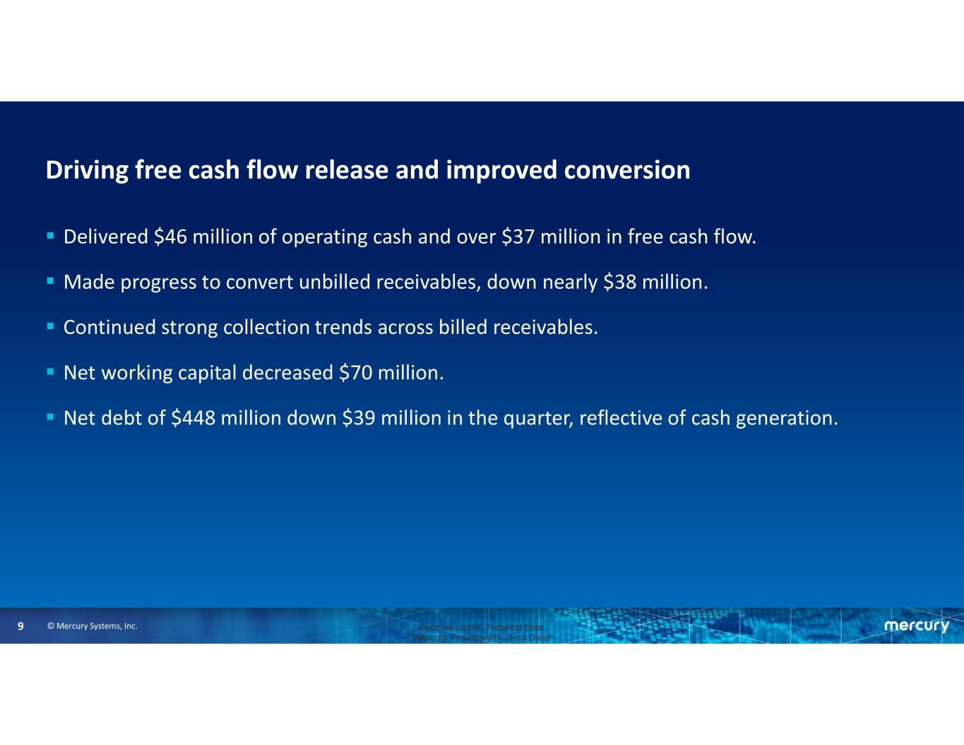 © Mercury Systems, Inc.9 Does not contain Technical Data. //Mercury Proprietary/No Tech Data// Driving free cash flow release and improved conversion  Delivered $46 million of operating cash and over $37 million in free cash flow.  Made progress to convert unbilled receivables, down nearly $38 million.  Continued strong collection trends across billed receivables.  Net working capital decreased $70 million.  Net debt of $448 million down $39 million in the quarter, reflective of cash generation.
