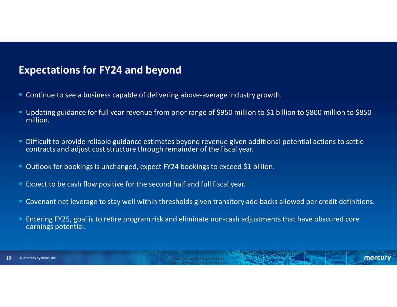 © Mercury Systems, Inc.10 Does not contain Technical Data. //Mercury Proprietary/No Tech Data// Expectations for FY24 and beyond  Continue to see a business capable of delivering above-average industry growth.  Updating guidance for full year revenue from prior range of $950 million to $1 billion to $800 million to $850 million.  Difficult to provide reliable guidance estimates beyond revenue given additional potential actions to settle contracts and adjust cost structure through remainder of the fiscal year.  Outlook for bookings is unchanged, expect FY24 bookings to exceed $1 billion.  Expect to be cash flow positive for the second half and full fiscal year.  Covenant net leverage to stay well within thresholds given transitory add backs allowed per credit definitions.  Entering FY25, goal is to retire program risk and eliminate non-cash adjustments that have obscured core earnings potential.
