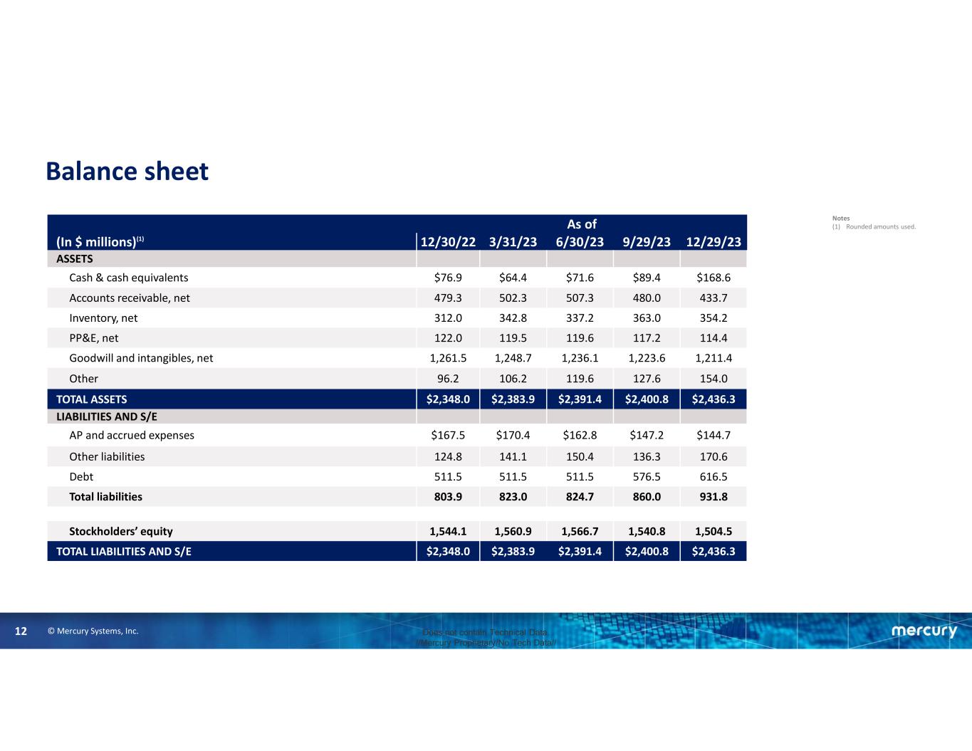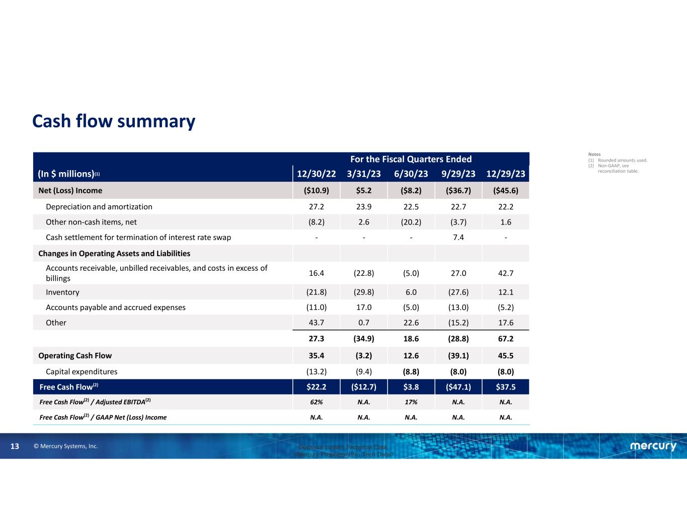 © Mercury Systems, Inc.12 Does not contain Technical Data. //Mercury Proprietary/No Tech Data// Balance sheet As of 12/29/239/29/236/30/233/31/2312/30/22(In $ millions)(1) ASSETS $168.6$89.4$71.6$64.4$76.9Cash & cash equivalents 433.7480.0507.3502.3479.3Accounts receivable, net 354.2363.0337.2342.8312.0Inventory, net 114.4117.2119.6119.5122.0PP&E, net 1,211.41,223.61,236.11,248.71,261.5Goodwill and intangibles, net 154.0127.6119.6106.296.2Other $2,436.3$2,400.8$2,391.4$2,383.9$2,348.0TOTAL ASSETS LIABILITIES AND S/E $144.7$147.2$162.8$170.4$167.5AP and accrued expenses 170.6136.3150.4141.1124.8Other liabilities 616.5576.5511.5511.5511.5Debt 931.8860.0824.7823.0803.9Total liabilities 1,504.51,540.81,566.71,560.91,544.1Stockholders’ equity $2,436.3$2,400.8$2,391.4$2,383.9$2,348.0TOTAL LIABILITIES AND S/E Notes (1) Rounded amounts used.