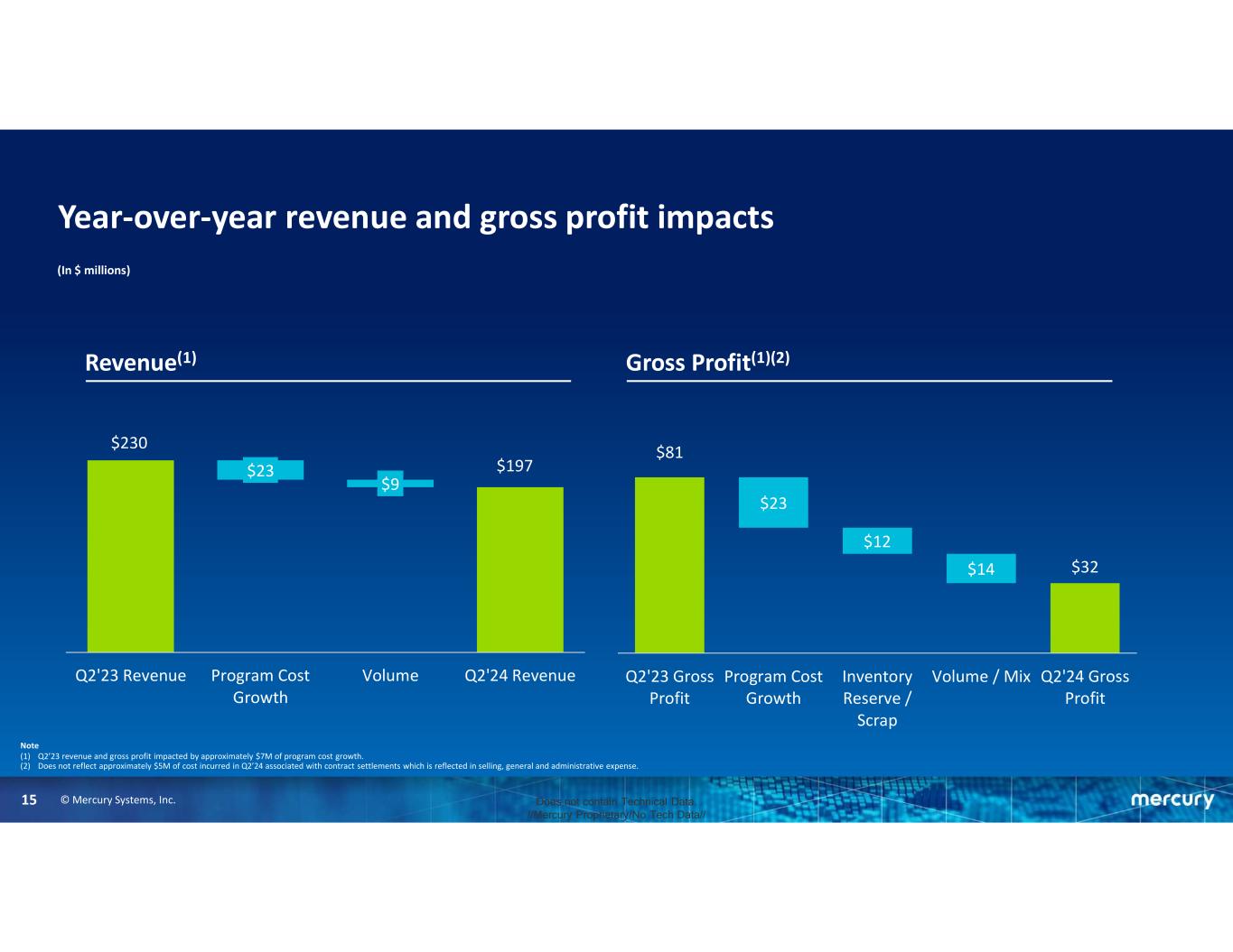 © Mercury Systems, Inc. Does not contain Technical Data. //Mercury Proprietary/No Tech Data// Year-over-year revenue and gross profit impacts 15 Revenue(1) (In $ millions) Gross Profit(1)(2) $230 $197$23 $9 Q2'23 Revenue Program Cost Growth Volume Q2'24 Revenue $81 $32 $23 $12 $14 Q2'23 Gross Profit Program Cost Growth Inventory Reserve / Scrap Volume / Mix Q2'24 Gross Profit Note (1) Q2’23 revenue and gross profit impacted by approximately $7M of program cost growth. (2) Does not reflect approximately $5M of cost incurred in Q2’24 associated with contract settlements which is reflected in selling, general and administrative expense.
