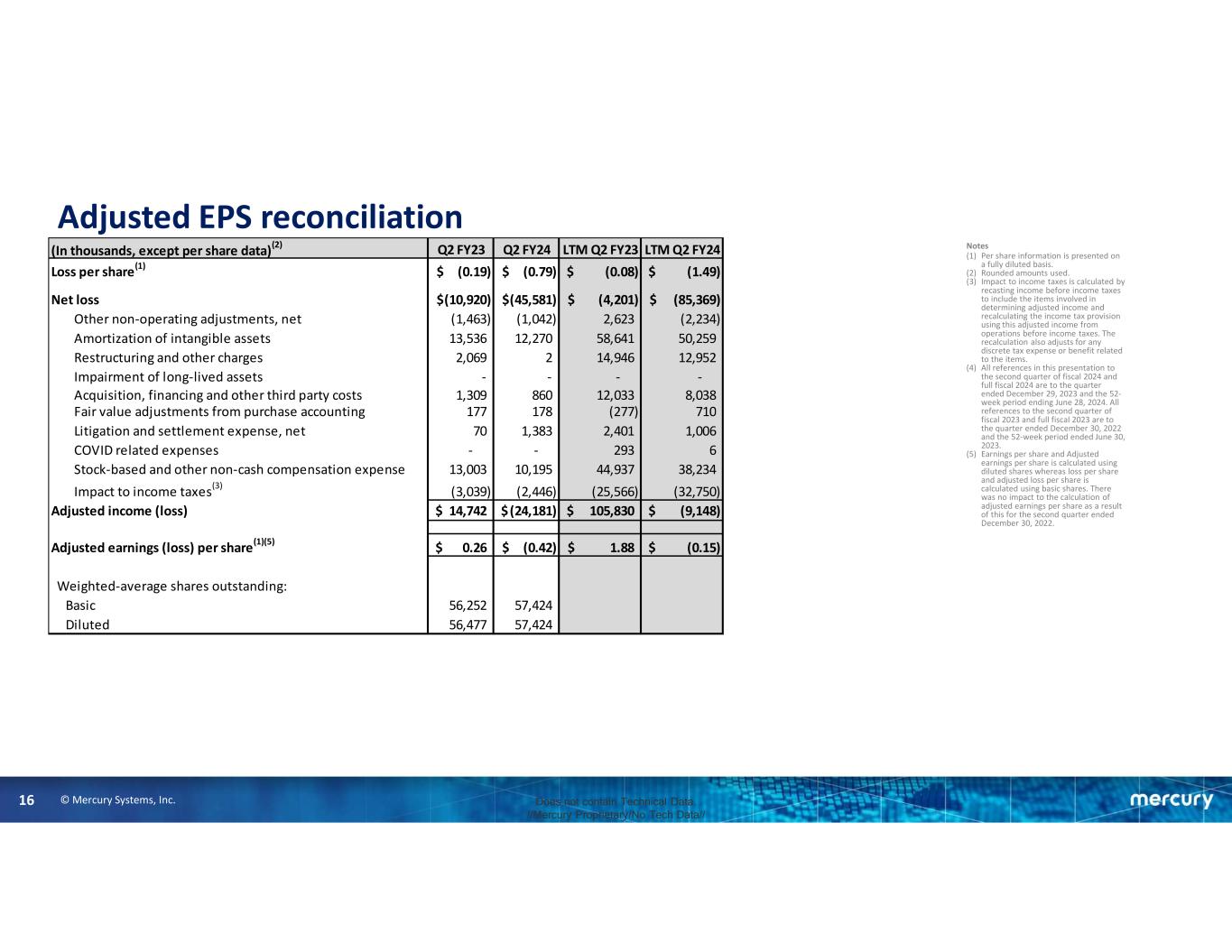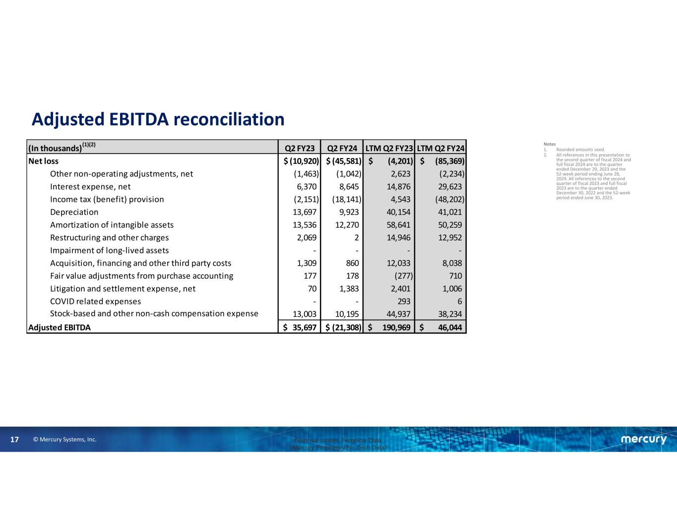 © Mercury Systems, Inc.16 Does not contain Technical Data. //Mercury Proprietary/No Tech Data// Adjusted EPS reconciliation Notes (1) Per share information is presented on a fully diluted basis. (2) Rounded amounts used. (3) Impact to income taxes is calculated by recasting income before income taxes to include the items involved in determining adjusted income and recalculating the income tax provision using this adjusted income from operations before income taxes. The recalculation also adjusts for any discrete tax expense or benefit related to the items. (4) All references in this presentation to the second quarter of fiscal 2024 and full fiscal 2024 are to the quarter ended December 29, 2023 and the 52- week period ending June 28, 2024. All references to the second quarter of fiscal 2023 and full fiscal 2023 are to the quarter ended December 30, 2022 and the 52-week period ended June 30, 2023. (5) Earnings per share and Adjusted earnings per share is calculated using diluted shares whereas loss per share and adjusted loss per share is calculated using basic shares. There was no impact to the calculation of adjusted earnings per share as a result of this for the second quarter ended December 30, 2022. (In thousands, except per share data)(2) Q2 FY23 Q2 FY24 LTM Q2 FY23 LTM Q2 FY24 Loss per share(1) (0.19)$ (0.79)$ (0.08)$ (1.49)$ Net loss (10,920)$ (45,581)$ (4,201)$ (85,369)$ Other non-operating adjustments, net (1,463) (1,042) 2,623 (2,234) Amortization of intangible assets 13,536 12,270 58,641 50,259 Restructuring and other charges 2,069 2 14,946 12,952 Impairment of long-lived assets - - - - Acquisition, financing and other third party costs 1,309 860 12,033 8,038 Fair value adjustments from purchase accounting 177 178 (277) 710 Litigation and settlement expense, net 70 1,383 2,401 1,006 COVID related expenses - - 293 6 Stock-based and other non-cash compensation expense 13,003 10,195 44,937 38,234 Impact to income taxes(3) (3,039) (2,446) (25,566) (32,750) Adjusted income (loss) 14,742$ (24,181)$ 105,830$ (9,148)$ Adjusted earnings (loss) per share(1)(5) 0.26$ (0.42)$ 1.88$ (0.15)$ Weighted-average shares outstanding: Basic 56,252 57,424 Diluted 56,477 57,424