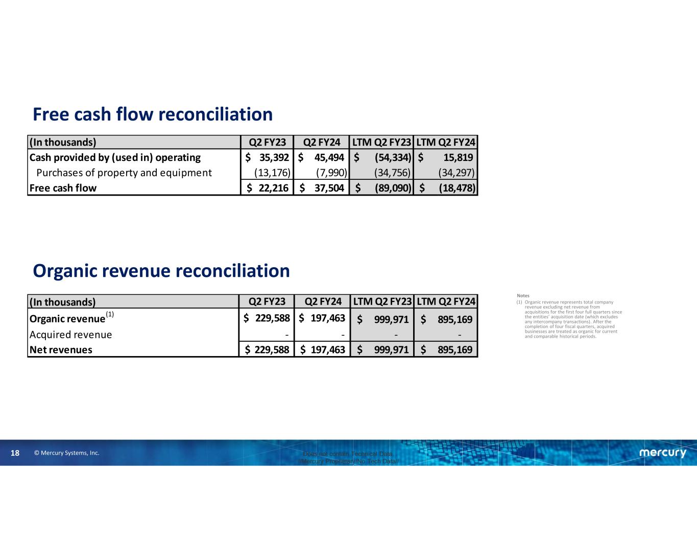 © Mercury Systems, Inc.17 Does not contain Technical Data. //Mercury Proprietary/No Tech Data// Adjusted EBITDA reconciliation Notes 1. Rounded amounts used. 2. All references in this presentation to the second quarter of fiscal 2024 and full fiscal 2024 are to the quarter ended December 29, 2023 and the 52-week period ending June 28, 2024. All references to the second quarter of fiscal 2023 and full fiscal 2023 are to the quarter ended December 30, 2022 and the 52-week period ended June 30, 2023. (In thousands)(1)(2) Q2 FY23 Q2 FY24 LTM Q2 FY23 LTM Q2 FY24 Net loss (10,920)$ (45,581)$ (4,201)$ (85,369)$ Other non-operating adjustments, net (1,463) (1,042) 2,623 (2,234) Interest expense, net 6,370 8,645 14,876 29,623 Income tax (benefit) provision (2,151) (18,141) 4,543 (48,202) Depreciation 13,697 9,923 40,154 41,021 Amortization of intangible assets 13,536 12,270 58,641 50,259 Restructuring and other charges 2,069 2 14,946 12,952 Impairment of long-lived assets - - - - Acquisition, financing and other third party costs 1,309 860 12,033 8,038 Fair value adjustments from purchase accounting 177 178 (277) 710 Litigation and settlement expense, net 70 1,383 2,401 1,006 COVID related expenses - - 293 6 Stock-based and other non-cash compensation expense 13,003 10,195 44,937 38,234 Adjusted EBITDA 35,697$ (21,308)$ 190,969$ 46,044$