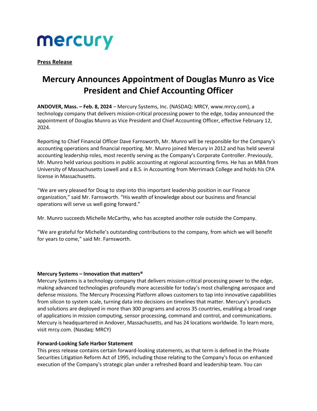 Press Release Mercury Announces Appointment of Douglas Munro as Vice President and Chief Accounting Officer ANDOVER, Mass. – Feb. 8, 2024 – Mercury Systems, Inc. (NASDAQ: MRCY, www.mrcy.com), a technology company that delivers mission-critical processing power to the edge, today announced the appointment of Douglas Munro as Vice President and Chief Accounting Officer, effective February 12, 2024. Reporting to Chief Financial Officer Dave Farnsworth, Mr. Munro will be responsible for the Company's accounting operations and financial reporting. Mr. Munro joined Mercury in 2012 and has held several accounting leadership roles, most recently serving as the Company’s Corporate Controller. Previously, Mr. Munro held various positions in public accounting at regional accounting firms. He has an MBA from University of Massachusetts Lowell and a B.S. in Accounting from Merrimack College and holds his CPA license in Massachusetts. “We are very pleased for Doug to step into this important leadership position in our Finance organization,” said Mr. Farnsworth. “His wealth of knowledge about our business and financial operations will serve us well going forward.” Mr. Munro succeeds Michelle McCarthy, who has accepted another role outside the Company. “We are grateful for Michelle’s outstanding contributions to the company, from which we will benefit for years to come,” said Mr. Farnsworth. Mercury Systems – Innovation that matters® Mercury Systems is a technology company that delivers mission-critical processing power to the edge, making advanced technologies profoundly more accessible for today’s most challenging aerospace and defense missions. The Mercury Processing Platform allows customers to tap into innovative capabilities from silicon to system scale, turning data into decisions on timelines that matter. Mercury’s products and solutions are deployed in more than 300 programs and across 35 countries, enabling a broad range of applications in mission computing, sensor processing, command and control, and communications. Mercury is headquartered in Andover, Massachusetts, and has 24 locations worldwide. To learn more, visit mrcy.com. (Nasdaq: MRCY) Forward-Looking Safe Harbor Statement This press release contains certain forward-looking statements, as that term is defined in the Private Securities Litigation Reform Act of 1995, including those relating to the Company's focus on enhanced execution of the Company's strategic plan under a refreshed Board and leadership team. You can