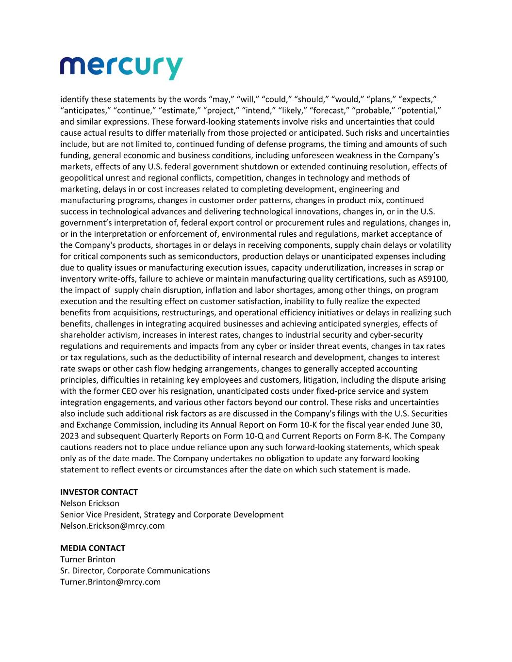 identify these statements by the words “may,” “will,” “could,” “should,” “would,” “plans,” “expects,” “anticipates,” “continue,” “estimate,” “project,” “intend,” “likely,” “forecast,” “probable,” “potential,” and similar expressions. These forward-looking statements involve risks and uncertainties that could cause actual results to differ materially from those projected or anticipated. Such risks and uncertainties include, but are not limited to, continued funding of defense programs, the timing and amounts of such funding, general economic and business conditions, including unforeseen weakness in the Company’s markets, effects of any U.S. federal government shutdown or extended continuing resolution, effects of geopolitical unrest and regional conflicts, competition, changes in technology and methods of marketing, delays in or cost increases related to completing development, engineering and manufacturing programs, changes in customer order patterns, changes in product mix, continued success in technological advances and delivering technological innovations, changes in, or in the U.S. government’s interpretation of, federal export control or procurement rules and regulations, changes in, or in the interpretation or enforcement of, environmental rules and regulations, market acceptance of the Company's products, shortages in or delays in receiving components, supply chain delays or volatility for critical components such as semiconductors, production delays or unanticipated expenses including due to quality issues or manufacturing execution issues, capacity underutilization, increases in scrap or inventory write-offs, failure to achieve or maintain manufacturing quality certifications, such as AS9100, the impact of supply chain disruption, inflation and labor shortages, among other things, on program execution and the resulting effect on customer satisfaction, inability to fully realize the expected benefits from acquisitions, restructurings, and operational efficiency initiatives or delays in realizing such benefits, challenges in integrating acquired businesses and achieving anticipated synergies, effects of shareholder activism, increases in interest rates, changes to industrial security and cyber-security regulations and requirements and impacts from any cyber or insider threat events, changes in tax rates or tax regulations, such as the deductibility of internal research and development, changes to interest rate swaps or other cash flow hedging arrangements, changes to generally accepted accounting principles, difficulties in retaining key employees and customers, litigation, including the dispute arising with the former CEO over his resignation, unanticipated costs under fixed-price service and system integration engagements, and various other factors beyond our control. These risks and uncertainties also include such additional risk factors as are discussed in the Company's filings with the U.S. Securities and Exchange Commission, including its Annual Report on Form 10-K for the fiscal year ended June 30, 2023 and subsequent Quarterly Reports on Form 10-Q and Current Reports on Form 8-K. The Company cautions readers not to place undue reliance upon any such forward-looking statements, which speak only as of the date made. The Company undertakes no obligation to update any forward looking statement to reflect events or circumstances after the date on which such statement is made. INVESTOR CONTACT Nelson Erickson Senior Vice President, Strategy and Corporate Development Nelson.Erickson@mrcy.com MEDIA CONTACT Turner Brinton Sr. Director, Corporate Communications Turner.Brinton@mrcy.com
