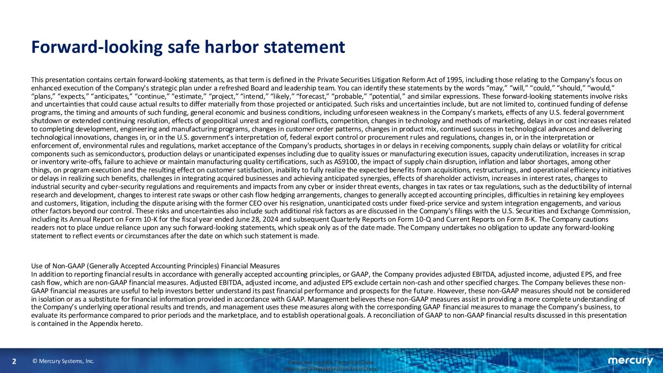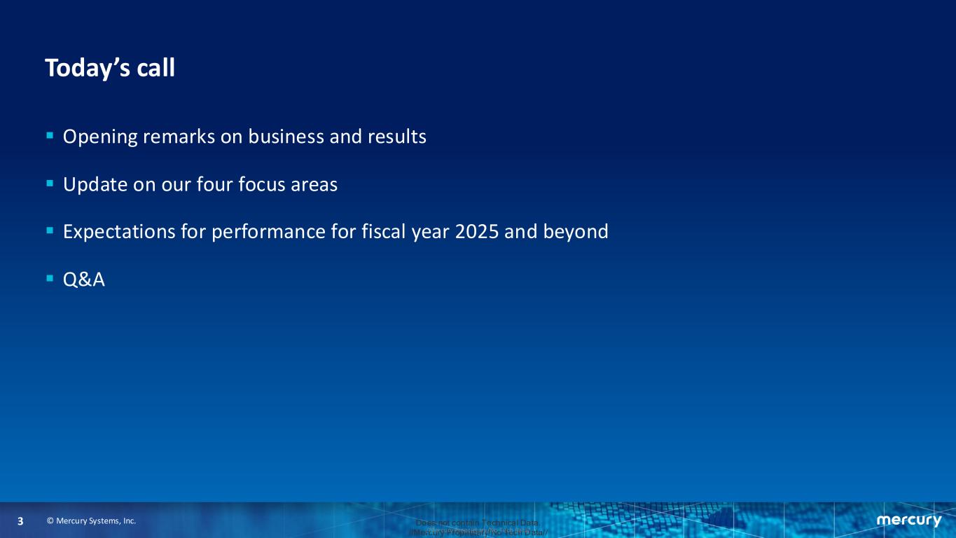 © Mercury Systems, Inc.2 Does not contain Technical Data. //Mercury Proprietary/No Tech Data///Mercury Proprietary/No Tech Data/ Forward-looking safe harbor statement This presentation contains certain forward-looking statements, as that term is defined in the Private Securities Litigation Reform Act of 1995, including those relating to the Company's focus on enhanced execution of the Company's strategic plan under a refreshed Board and leadership team. You can identify these statements by the words “may,” “will,” “could,” “should,” “would,” “plans,” “expects,” “anticipates,” “continue,” “estimate,” “project,” “intend,” “likely,” “forecast,” “probable,” “potential,” and similar expressions. These forward-looking statements involve risks and uncertainties that could cause actual results to differ materially from those projected or anticipated. Such risks and uncertainties include, but are not limited to, continued funding of defense programs, the timing and amounts of such funding, general economic and business conditions, including unforeseen weakness in the Company’s markets, effects of any U.S. federal government shutdown or extended continuing resolution, effects of geopolitical unrest and regional conflicts, competition, changes in technology and methods of marketing, delays in or cost increases related to completing development, engineering and manufacturing programs, changes in customer order patterns, changes in product mix, continued success in technological advances and delivering technological innovations, changes in, or in the U.S. government’s interpretation of, federal export control or procurement rules and regulations, changes in, or in the interpretation or enforcement of, environmental rules and regulations, market acceptance of the Company's products, shortages in or delays in receiving components, supply chain delays or volatility for critical components such as semiconductors, production delays or unanticipated expenses including due to quality issues or manufacturing execution issues, capacity underutilization, increases in scrap or inventory write-offs, failure to achieve or maintain manufacturing quality certifications, such as AS9100, the impact of supply chain disruption, inflation and labor shortages, among other things, on program execution and the resulting effect on customer satisfaction, inability to fully realize the expected benefits from acquisitions, restructurings, and operational efficiency initiatives or delays in realizing such benefits, challenges in integrating acquired businesses and achieving anticipated synergies, effects of shareholder activism, increases in interest rates, changes to industrial security and cyber-security regulations and requirements and impacts from any cyber or insider threat events, changes in tax rates or tax regulations, such as the deductibility of internal research and development, changes to interest rate swaps or other cash flow hedging arrangements, changes to generally accepted accounting principles, difficulties in retaining key employees and customers, litigation, including the dispute arising with the former CEO over his resignation, unanticipated costs under fixed-price service and system integration engagements, and various other factors beyond our control. These risks and uncertainties also include such additional risk factors as are discussed in the Company's filings with the U.S. Securities and Exchange Commission, including its Annual Report on Form 10-K for the fiscal year ended June 28, 2024 and subsequent Quarterly Reports on Form 10-Q and Current Reports on Form 8-K. The Company cautions readers not to place undue reliance upon any such forward-looking statements, which speak only as of the date made. The Company undertakes no obligation to update any forward-looking statement to reflect events or circumstances after the date on which such statement is made. Use of Non-GAAP (Generally Accepted Accounting Principles) Financial Measures In addition to reporting financial results in accordance with generally accepted accounting principles, or GAAP, the Company provides adjusted EBITDA, adjusted income, adjusted EPS, and free cash flow, which are non-GAAP financial measures. Adjusted EBITDA, adjusted income, and adjusted EPS exclude certain non-cash and other specified charges. The Company believes these non- GAAP financial measures are useful to help investors better understand its past financial performance and prospects for the future. However, these non-GAAP measures should not be considered in isolation or as a substitute for financial information provided in accordance with GAAP. Management believes these non-GAAP measures assist in providing a more complete understanding of the Company’s underlying operational results and trends, and management uses these measures along with the corresponding GAAP financial measures to manage the Company’s business, to evaluate its performance compared to prior periods and the marketplace, and to establish operational goals. A reconciliation of GAAP to non-GAAP financial results discussed in this presentation is contained in the Appendix hereto.