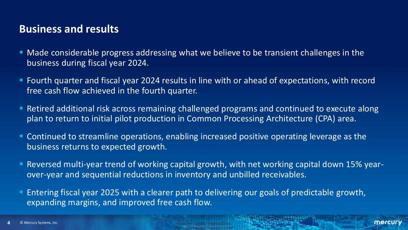 © Mercury Systems, Inc.3 Does not contain Technical Data. //Mercury Proprietary/No Tech Data///Mercury Proprietary/No Tech Data/ Today’s call ▪ Opening remarks on business and results ▪ Update on our four focus areas ▪ Expectations for performance for fiscal year 2025 and beyond ▪ Q&A