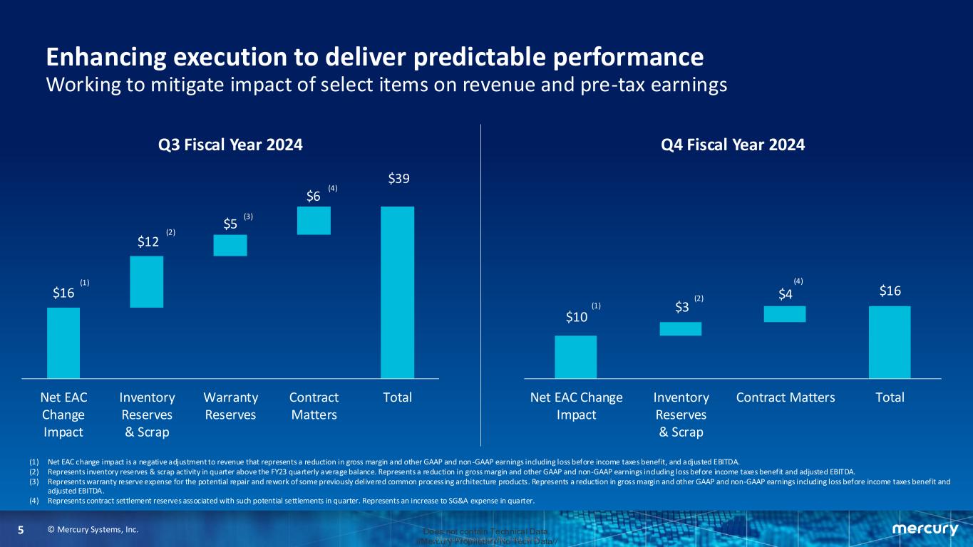 © Mercury Systems, Inc.4 Does not contain Technical Data. //Mercury Proprietary/No Tech Data///Mercury Proprietary/No Tech Data/ Business and results ▪ Made considerable progress addressing what we believe to be transient challenges in the business during fiscal year 2024. ▪ Fourth quarter and fiscal year 2024 results in line with or ahead of expectations, with record free cash flow achieved in the fourth quarter. ▪ Retired additional risk across remaining challenged programs and continued to execute along plan to return to initial pilot production in Common Processing Architecture (CPA) area. ▪ Continued to streamline operations, enabling increased positive operating leverage as the business returns to expected growth. ▪ Reversed multi-year trend of working capital growth, with net working capital down 15% year- over-year and sequential reductions in inventory and unbilled receivables. ▪ Entering fiscal year 2025 with a clearer path to delivering our goals of predictable growth, expanding margins, and improved free cash flow.