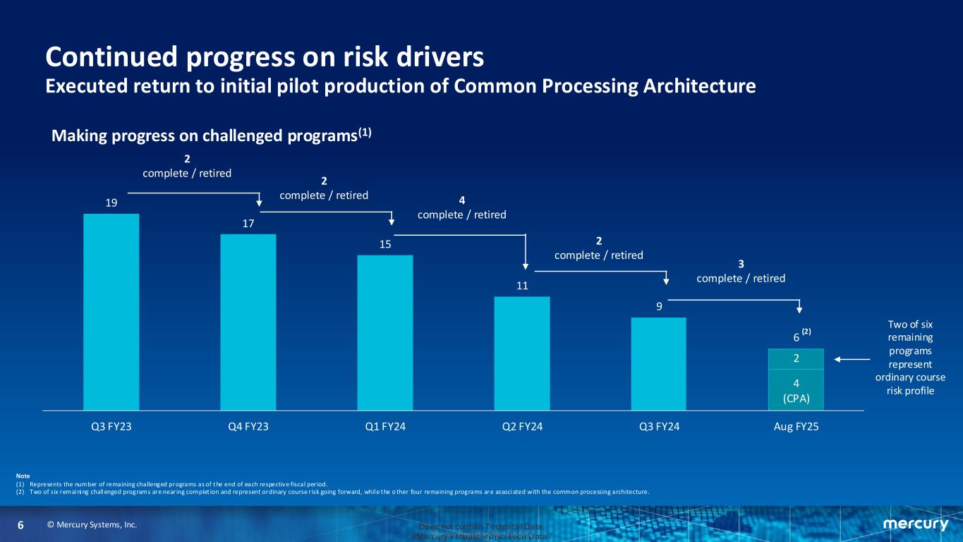 © Mercury Systems, Inc.5 Does not contain Technical Data. //Mercury Proprietary/No Tech Data///Mercury Proprietary/No Tech Data/ Enhancing execution to deliver predictable performance Working to mitigate impact of select items on revenue and pre-tax earnings $16 $39 $12 $5 $6 Net EAC Change Impact Inventory Reserves & Scrap Warranty Reserves Contract Matters Total (1) (2) (3) (4) (1) Net EAC change impact is a negative adjustment to revenue that represents a reduction in gross margin and other GAAP and non-GAAP earnings including loss before income taxes benefit, and adjusted EBITDA. (2) Represents inventory reserves & scrap activity in quarter above the FY23 quarterly average balance. Represents a reduction in gross margin and other GAAP and non-GAAP earnings including loss before income taxes benefit and adjusted EBITDA. (3) Represents warranty reserve expense for the potential repair and rework of some previously delivered common processing architecture products. Represents a reduction in gross margin and other GAAP and non-GAAP earnings including loss before income taxes benefit and adjusted EBITDA. (4) Represents contract settlement reserves associated with such potential settlements in quarter. Represents an increase to SG&A expense in quarter. $10 $16 $3 $4 Net EAC Change Impact Inventory Reserves & Scrap Contract Matters Total (1) (2) (4) Q3 Fiscal Year 2024 Q4 Fiscal Year 2024