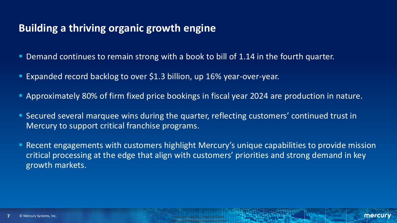 © Mercury Systems, Inc.6 Does not contain Technical Data. //Mercury Proprietary/No Tech Data///Mercury Proprietary/No Tech Data/ Continued progress on risk drivers Executed return to initial pilot production of Common Processing Architecture 4 (CPA) 19 17 15 11 9 2 6 Q3 FY23 Q4 FY23 Q1 FY24 Q2 FY24 Q3 FY24 Aug FY25 Note (1) Represents the number of remaining challenged programs as of the end of each respective fiscal period. (2) Two of six remaining challenged programs are nearing complet ion and represent ordinary course r isk going forward, while the o ther four remaining programs are associated with the common processing architecture. Making progress on challenged programs(1) 2 complete / retired 2 complete / retired 4 complete / retired 2 complete / retired 3 complete / retired (2) Two of six remaining programs represent ordinary course risk profile
