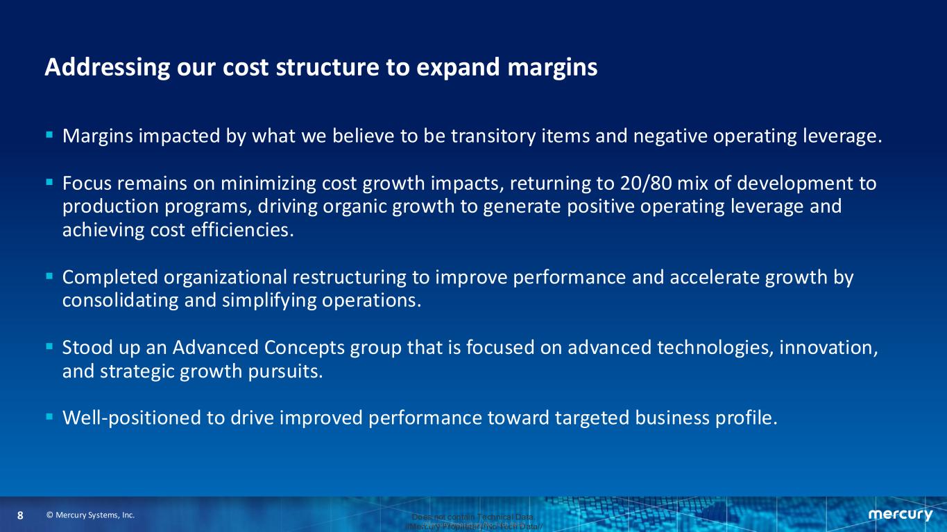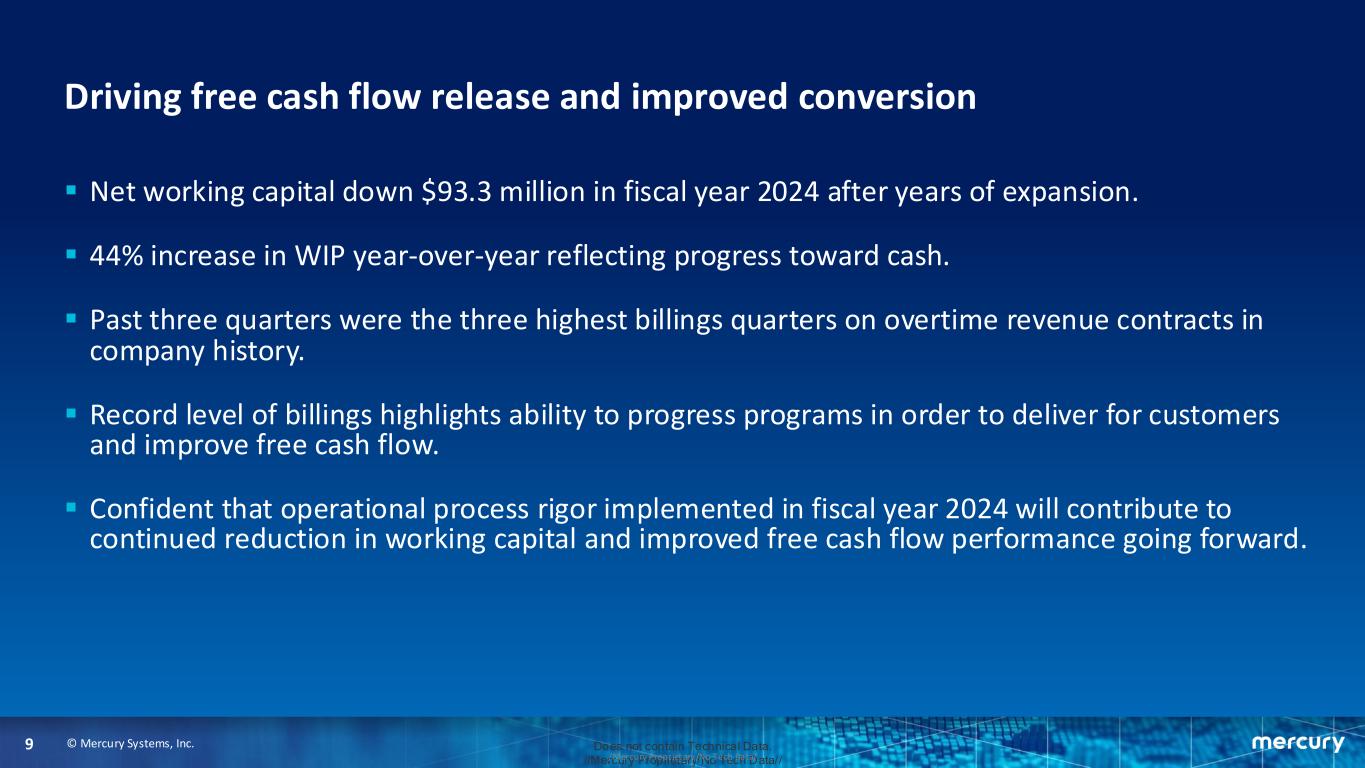 © Mercury Systems, Inc.8 Does not contain Technical Data. //Mercury Proprietary/No Tech Data///Mercury Proprietary/No Tech Data/ Addressing our cost structure to expand margins ▪ Margins impacted by what we believe to be transitory items and negative operating leverage. ▪ Focus remains on minimizing cost growth impacts, returning to 20/80 mix of development to production programs, driving organic growth to generate positive operating leverage and achieving cost efficiencies. ▪ Completed organizational restructuring to improve performance and accelerate growth by consolidating and simplifying operations. ▪ Stood up an Advanced Concepts group that is focused on advanced technologies, innovation, and strategic growth pursuits. ▪ Well-positioned to drive improved performance toward targeted business profile.