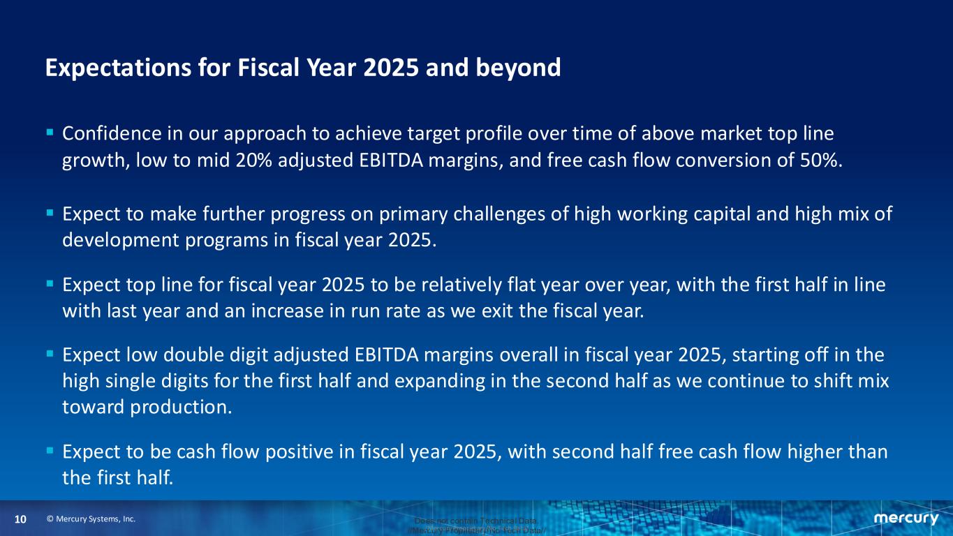 © Mercury Systems, Inc.9 Does not contain Technical Data. //Mercury Proprietary/No Tech Data///Mercury Proprietary/No Tech Data/ Driving free cash flow release and improved conversion ▪ Net working capital down $93.3 million in fiscal year 2024 after years of expansion. ▪ 44% increase in WIP year-over-year reflecting progress toward cash. ▪ Past three quarters were the three highest billings quarters on overtime revenue contracts in company history. ▪ Record level of billings highlights ability to progress programs in order to deliver for customers and improve free cash flow. ▪ Confident that operational process rigor implemented in fiscal year 2024 will contribute to continued reduction in working capital and improved free cash flow performance going forward.