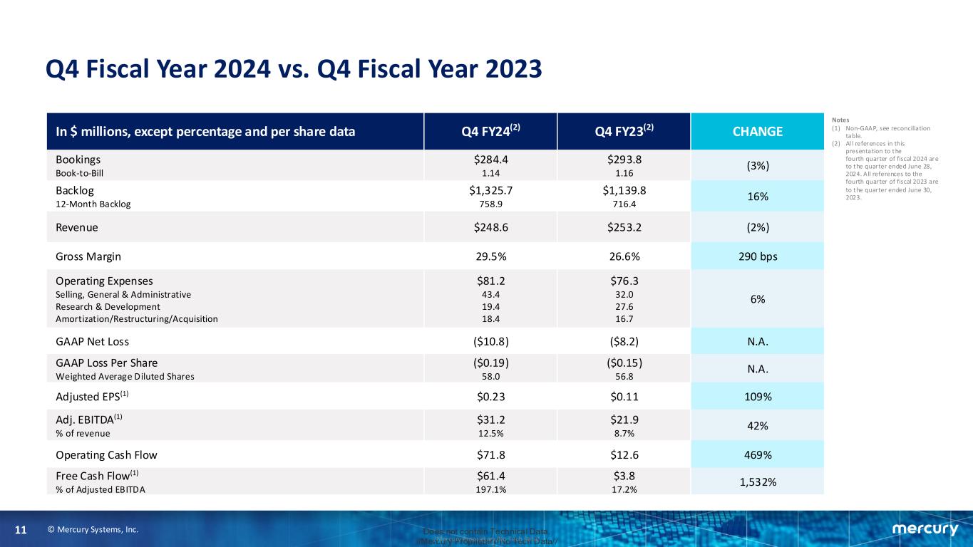 © Mercury Systems, Inc.10 Does not contain Technical Data. //Mercury Proprietary/No Tech Data///Mercury Proprietary/No Tech Data/ Expectations for Fiscal Year 2025 and beyond ▪ Confidence in our approach to achieve target profile over time of above market top line growth, low to mid 20% adjusted EBITDA margins, and free cash flow conversion of 50%. ▪ Expect to make further progress on primary challenges of high working capital and high mix of development programs in fiscal year 2025. ▪ Expect top line for fiscal year 2025 to be relatively flat year over year, with the first half in line with last year and an increase in run rate as we exit the fiscal year. ▪ Expect low double digit adjusted EBITDA margins overall in fiscal year 2025, starting off in the high single digits for the first half and expanding in the second half as we continue to shift mix toward production. ▪ Expect to be cash flow positive in fiscal year 2025, with second half free cash flow higher than the first half.