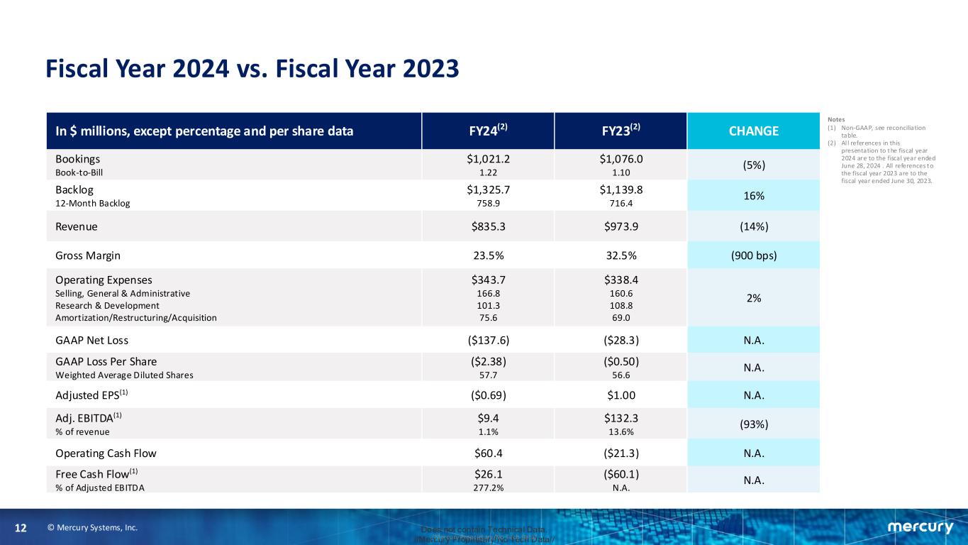 © Mercury Systems, Inc.11 Does not contain Technical Data. //Mercury Proprietary/No Tech Data///Mercury Proprietary/No Tech Data/ Q4 Fiscal Year 2024 vs. Q4 Fiscal Year 2023 In $ millions, except percentage and per share data Q4 FY24(2) Q4 FY23(2) CHANGE Bookings Book-to-Bill $284.4 1.14 $293.8 1.16 (3%) Backlog 12-Month Backlog $1,325.7 758.9 $1,139.8 716.4 16% Revenue $248.6 $253.2 (2%) Gross Margin 29.5% 26.6% 290 bps Operating Expenses Selling, General & Administrative Research & Development Amortization/Restructuring/Acquisition $81.2 43.4 19.4 18.4 $76.3 32.0 27.6 16.7 6% GAAP Net Loss ($10.8) ($8.2) N.A. GAAP Loss Per Share Weighted Average Diluted Shares ($0.19) 58.0 ($0.15) 56.8 N.A. Adjusted EPS(1) $0.23 $0.11 109% Adj. EBITDA(1) % of revenue $31.2 12.5% $21.9 8.7% 42% Operating Cash Flow $71.8 $12.6 469% Free Cash Flow(1) % of Adjusted EBITDA $61.4 197.1% $3.8 17.2% 1,532% Notes (1) Non-GAAP, see reconciliation table. (2) Al l references in this presentation to the fourth quarter of fiscal 2024 are to the quarter ended June 28, 2024. All references to the fourth quarter of fiscal 2023 are to the quarter ended June 30, 2023.