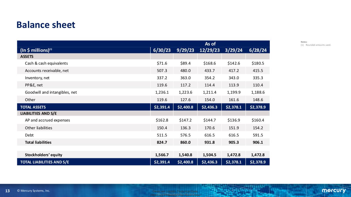 © Mercury Systems, Inc.12 Does not contain Technical Data. //Mercury Proprietary/No Tech Data///Mercury Proprietary/No Tech Data/ Fiscal Year 2024 vs. Fiscal Year 2023 In $ millions, except percentage and per share data FY24(2) FY23(2) CHANGE Bookings Book-to-Bill $1,021.2 1.22 $1,076.0 1.10 (5%) Backlog 12-Month Backlog $1,325.7 758.9 $1,139.8 716.4 16% Revenue $835.3 $973.9 (14%) Gross Margin 23.5% 32.5% (900 bps) Operating Expenses Selling, General & Administrative Research & Development Amortization/Restructuring/Acquisition $343.7 166.8 101.3 75.6 $338.4 160.6 108.8 69.0 2% GAAP Net Loss ($137.6) ($28.3) N.A. GAAP Loss Per Share Weighted Average Diluted Shares ($2.38) 57.7 ($0.50) 56.6 N.A. Adjusted EPS(1) ($0.69) $1.00 N.A. Adj. EBITDA(1) % of revenue $9.4 1.1% $132.3 13.6% (93%) Operating Cash Flow $60.4 ($21.3) N.A. Free Cash Flow(1) % of Adjusted EBITDA $26.1 277.2% ($60.1) N.A. N.A. Notes (1) Non-GAAP, see reconciliation table. (2) Al l references in this presentation to the fiscal year 2024 are to the fiscal year ended June 28, 2024 . All references to the fiscal year 2023 are to the fiscal year ended June 30, 2023.