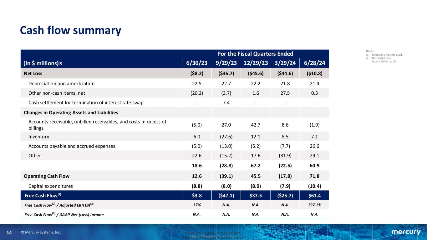 © Mercury Systems, Inc.13 Does not contain Technical Data. //Mercury Proprietary/No Tech Data///Mercury Proprietary/No Tech Data/ Balance sheet As of (In $ millions)(1) 6/30/23 9/29/23 12/29/23 3/29/24 6/28/24 ASSETS Cash & cash equivalents $71.6 $89.4 $168.6 $142.6 $180.5 Accounts receivable, net 507.3 480.0 433.7 417.2 415.5 Inventory, net 337.2 363.0 354.2 343.0 335.3 PP&E, net 119.6 117.2 114.4 113.9 110.4 Goodwill and intangibles, net 1,236.1 1,223.6 1,211.4 1,199.9 1,188.6 Other 119.6 127.6 154.0 161.6 148.6 TOTAL ASSETS $2,391.4 $2,400.8 $2,436.3 $2,378.1 $2,378.9 LIABILITIES AND S/E AP and accrued expenses $162.8 $147.2 $144.7 $136.9 $160.4 Other liabilities 150.4 136.3 170.6 151.9 154.2 Debt 511.5 576.5 616.5 616.5 591.5 Total liabilities 824.7 860.0 931.8 905.3 906.1 Stockholders’ equity 1,566.7 1,540.8 1,504.5 1,472.8 1,472.8 TOTAL LIABILITIES AND S/E $2,391.4 $2,400.8 $2,436.3 $2,378.1 $2,378.9 Notes (1) Rounded amounts used.