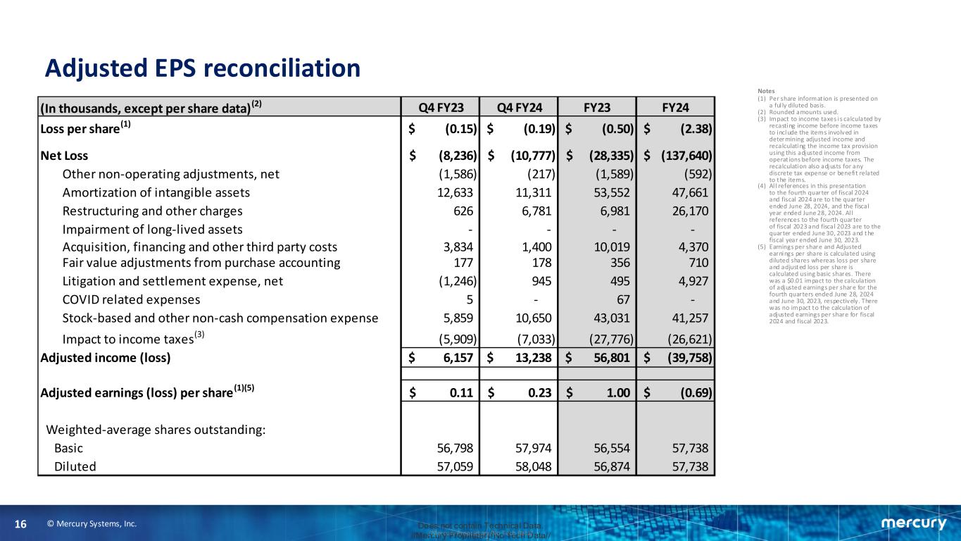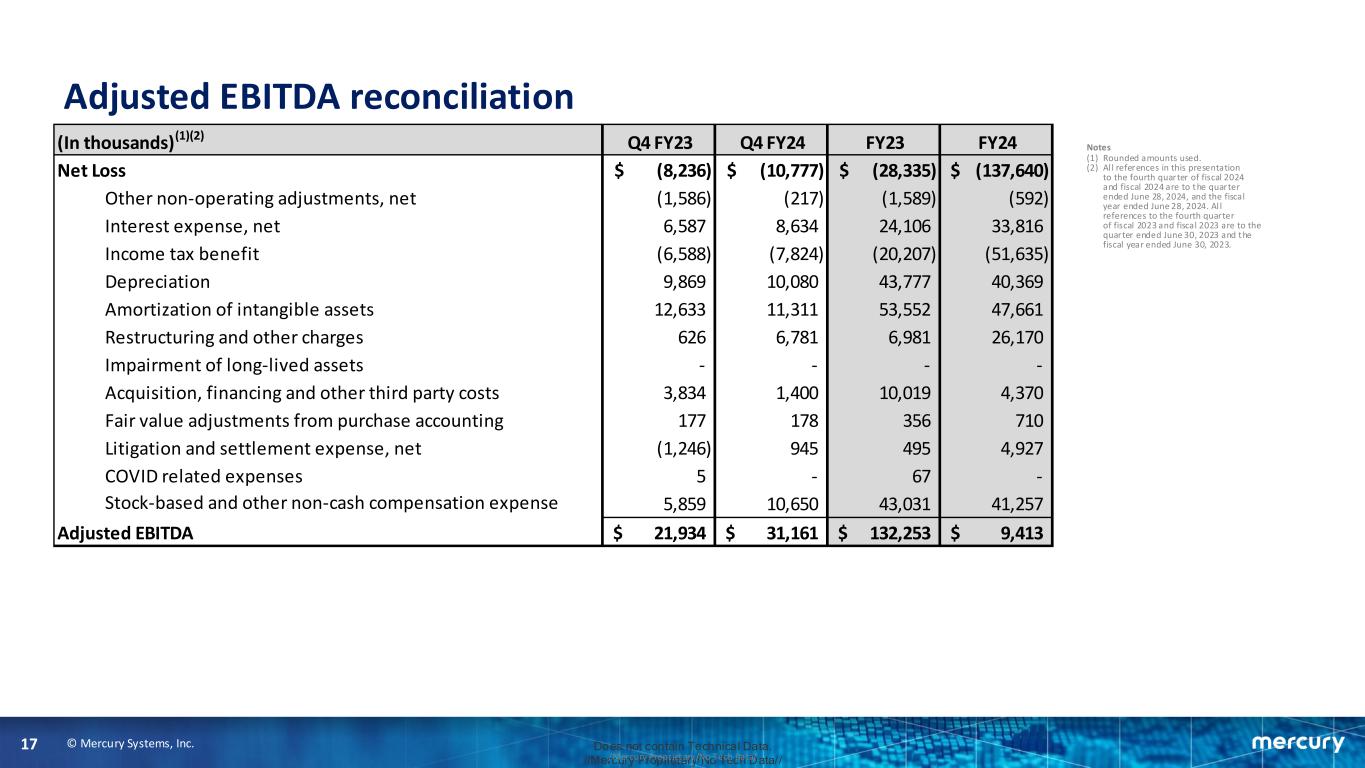 © Mercury Systems, Inc.16 Does not contain Technical Data. //Mercury Proprietary/No Tech Data///Mercury Proprietary/No Tech Data/ Adjusted EPS reconciliation Notes (1) Per share informat ion is presented on a ful ly diluted basis. (2) Rounded amounts used. (3) Impact to income taxes i s calculated by recasting income before income taxes to include the items involved in determining adjusted income and recalculating the income tax provision using this adjusted income from operat ions before income taxes. The recalculation also adjusts for any discrete tax expense or benefi t related to the items. (4) Al l references in this presentation to the fourth quarter of fiscal 2024 and fiscal 2024 are to the quarter ended June 28, 2024, and the fiscal year ended June 28, 2024. Al l references to the fourth quarter of fiscal 2023 and fiscal 2023 are to the quarter ended June 30, 2023 and the fiscal year ended June 30, 2023. (5) Earnings per share and Adjusted earnings per share is calculated using diluted shares whereas loss per share and adjusted loss per share is calculated using basic shares. There was a $0.01 impact to the calculation of adjusted earnings per share for the fourth quarters ended June 28, 2024 and June 30, 2023, respectively . There was no impact to the calculation of adjusted earnings per share for fiscal 2024 and fiscal 2023. (In thousands, except per share data)(2) Q4 FY23 Q4 FY24 FY23 FY24 Loss per share(1) (0.15)$ (0.19)$ (0.50)$ (2.38)$ Net Loss (8,236)$ (10,777)$ (28,335)$ (137,640)$ Other non-operating adjustments, net (1,586) (217) (1,589) (592) Amortization of intangible assets 12,633 11,311 53,552 47,661 Restructuring and other charges 626 6,781 6,981 26,170 Impairment of long-lived assets - - - - Acquisition, financing and other third party costs 3,834 1,400 10,019 4,370 Fair value adjustments from purchase accounting 177 178 356 710 Litigation and settlement expense, net (1,246) 945 495 4,927 COVID related expenses 5 - 67 - Stock-based and other non-cash compensation expense 5,859 10,650 43,031 41,257 Impact to income taxes(3) (5,909) (7,033) (27,776) (26,621) Adjusted income (loss) 6,157$ 13,238$ 56,801$ (39,758)$ Adjusted earnings (loss) per share(1)(5) 0.11$ 0.23$ 1.00$ (0.69)$ Weighted-average shares outstanding: Basic 56,798 57,974 56,554 57,738 Diluted 57,059 58,048 56,874 57,738