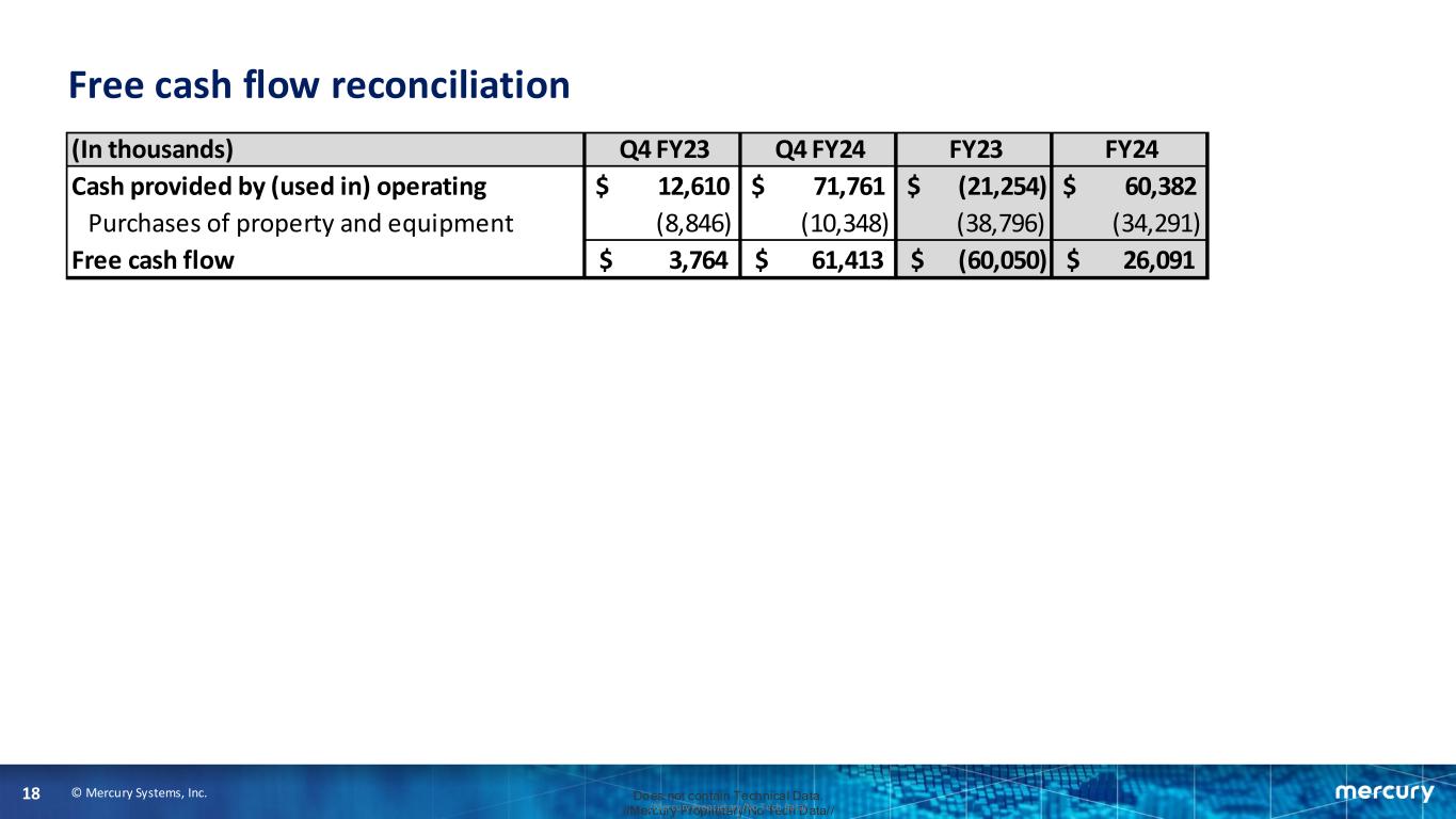 © Mercury Systems, Inc.17 Does not contain Technical Data. //Mercury Proprietary/No Tech Data///Mercury Proprietary/No Tech Data/ Adjusted EBITDA reconciliation Notes (1) Rounded amounts used. (2) Al l references in this presentation to the fourth quarter of fiscal 2024 and fiscal 2024 are to the quarter ended June 28, 2024, and the fiscal year ended June 28, 2024. Al l references to the fourth quarter of fiscal 2023 and fiscal 2023 are to the quarter ended June 30, 2023 and the fiscal year ended June 30, 2023. (In thousands)(1)(2) Q4 FY23 Q4 FY24 FY23 FY24 Net Loss (8,236)$ (10,777)$ (28,335)$ (137,640)$ Other non-operating adjustments, net (1,586) (217) (1,589) (592) Interest expense, net 6,587 8,634 24,106 33,816 Income tax benefit (6,588) (7,824) (20,207) (51,635) Depreciation 9,869 10,080 43,777 40,369 Amortization of intangible assets 12,633 11,311 53,552 47,661 Restructuring and other charges 626 6,781 6,981 26,170 Impairment of long-lived assets - - - - Acquisition, financing and other third party costs 3,834 1,400 10,019 4,370 Fair value adjustments from purchase accounting 177 178 356 710 Litigation and settlement expense, net (1,246) 945 495 4,927 COVID related expenses 5 - 67 - Stock-based and other non-cash compensation expense 5,859 10,650 43,031 41,257 Adjusted EBITDA 21,934$ 31,161$ 132,253$ 9,413$