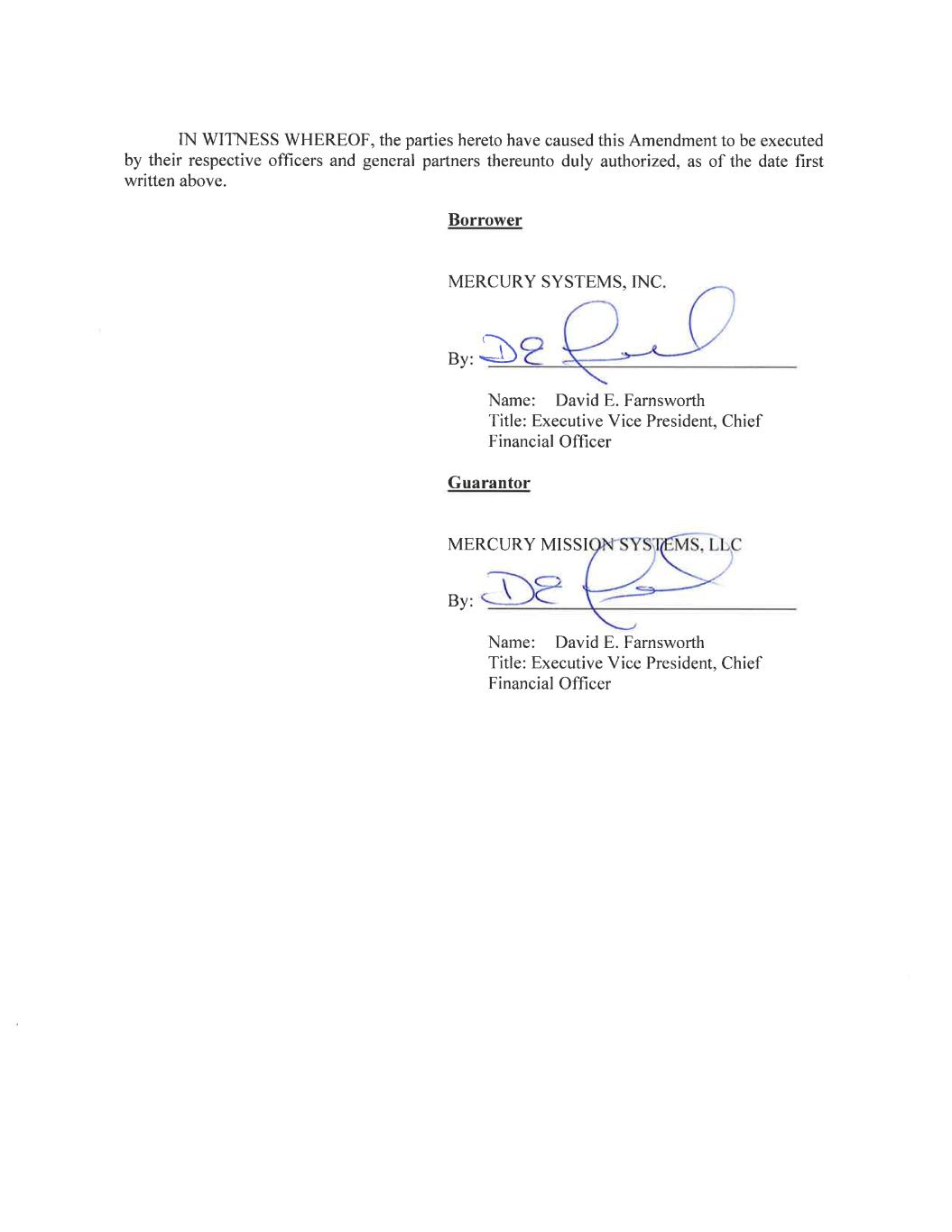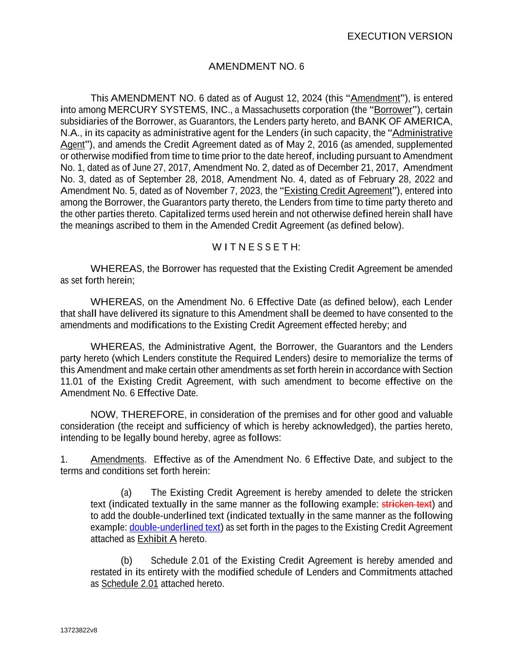 EXECUTION VERSION 13723822v8 AMENDMENT NO. 6 This AMENDMENT NO. 6 dated as of August 12, 2024 (this “Amendment”), is entered into among MERCURY SYSTEMS, INC., a Massachusetts corporation (the “Borrower”), certain subsidiaries of the Borrower, as Guarantors, the Lenders party hereto, and BANK OF AMERICA, N.A., in its capacity as administrative agent for the Lenders (in such capacity, the “Administrative Agent”), and amends the Credit Agreement dated as of May 2, 2016 (as amended, supplemented or otherwise modified from time to time prior to the date hereof, including pursuant to Amendment No. 1, dated as of June 27, 2017, Amendment No. 2, dated as of December 21, 2017, Amendment No. 3, dated as of September 28, 2018, Amendment No. 4, dated as of February 28, 2022 and Amendment No. 5, dated as of November 7, 2023, the “Existing Credit Agreement”), entered into among the Borrower, the Guarantors party thereto, the Lenders from time to time party thereto and the other parties thereto. Capitalized terms used herein and not otherwise defined herein shall have the meanings ascribed to them in the Amended Credit Agreement (as defined below). W I T N E S S E T H: WHEREAS, the Borrower has requested that the Existing Credit Agreement be amended as set forth herein; WHEREAS, on the Amendment No. 6 Effective Date (as defined below), each Lender that shall have delivered its signature to this Amendment shall be deemed to have consented to the amendments and modifications to the Existing Credit Agreement effected hereby; and WHEREAS, the Administrative Agent, the Borrower, the Guarantors and the Lenders party hereto (which Lenders constitute the Required Lenders) desire to memorialize the terms of this Amendment and make certain other amendments as set forth herein in accordance with Section 11.01 of the Existing Credit Agreement, with such amendment to become effective on the Amendment No. 6 Effective Date. NOW, THEREFORE, in consideration of the premises and for other good and valuable consideration (the receipt and sufficiency of which is hereby acknowledged), the parties hereto, intending to be legally bound hereby, agree as follows: 1. Amendments. Effective as of the Amendment No. 6 Effective Date, and subject to the terms and conditions set forth herein: (a) The Existing Credit Agreement is hereby amended to delete the stricken text (indicated textually in the same manner as the following example: stricken text) and to add the double-underlined text (indicated textually in the same manner as the following example: double-underlined text) as set forth in the pages to the Existing Credit Agreement attached as Exhibit A hereto. (b) Schedule 2.01 of the Existing Credit Agreement is hereby amended and restated in its entirety with the modified schedule of Lenders and Commitments attached as Schedule 2.01 attached hereto.