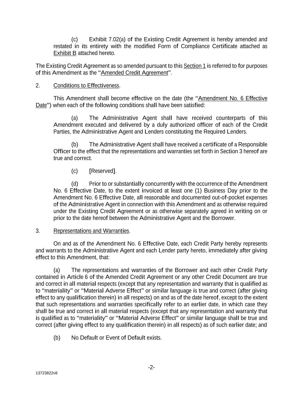 -2- 13723822v8 (c) Exhibit 7.02(a) of the Existing Credit Agreement is hereby amended and restated in its entirety with the modified Form of Compliance Certificate attached as Exhibit B attached hereto. The Existing Credit Agreement as so amended pursuant to this Section 1 is referred to for purposes of this Amendment as the “Amended Credit Agreement”. 2. Conditions to Effectiveness. This Amendment shall become effective on the date (the “Amendment No. 6 Effective Date”) when each of the following conditions shall have been satisfied: (a) The Administrative Agent shall have received counterparts of this Amendment executed and delivered by a duly authorized officer of each of the Credit Parties, the Administrative Agent and Lenders constituting the Required Lenders. (b) The Administrative Agent shall have received a certificate of a Responsible Officer to the effect that the representations and warranties set forth in Section 3 hereof are true and correct. (c) [Reserved]. (d) Prior to or substantially concurrently with the occurrence of the Amendment No. 6 Effective Date, to the extent invoiced at least one (1) Business Day prior to the Amendment No. 6 Effective Date, all reasonable and documented out-of-pocket expenses of the Administrative Agent in connection with this Amendment and as otherwise required under the Existing Credit Agreement or as otherwise separately agreed in writing on or prior to the date hereof between the Administrative Agent and the Borrower. 3. Representations and Warranties. On and as of the Amendment No. 6 Effective Date, each Credit Party hereby represents and warrants to the Administrative Agent and each Lender party hereto, immediately after giving effect to this Amendment, that: (a) The representations and warranties of the Borrower and each other Credit Party contained in Article 6 of the Amended Credit Agreement or any other Credit Document are true and correct in all material respects (except that any representation and warranty that is qualified as to “materiality” or “Material Adverse Effect” or similar language is true and correct (after giving effect to any qualification therein) in all respects) on and as of the date hereof, except to the extent that such representations and warranties specifically refer to an earlier date, in which case they shall be true and correct in all material respects (except that any representation and warranty that is qualified as to “materiality” or “Material Adverse Effect” or similar language shall be true and correct (after giving effect to any qualification therein) in all respects) as of such earlier date; and (b) No Default or Event of Default exists.