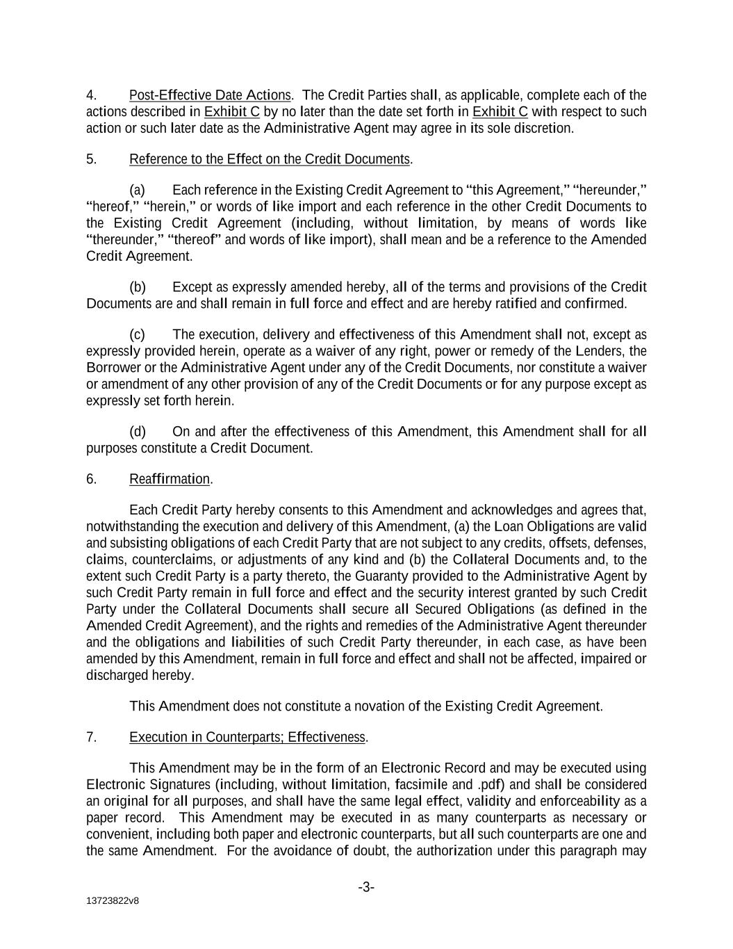 -3- 13723822v8 4. Post-Effective Date Actions. The Credit Parties shall, as applicable, complete each of the actions described in Exhibit C by no later than the date set forth in Exhibit C with respect to such action or such later date as the Administrative Agent may agree in its sole discretion. 5. Reference to the Effect on the Credit Documents. (a) Each reference in the Existing Credit Agreement to “this Agreement,” “hereunder,” “hereof,” “herein,” or words of like import and each reference in the other Credit Documents to the Existing Credit Agreement (including, without limitation, by means of words like “thereunder,” “thereof” and words of like import), shall mean and be a reference to the Amended Credit Agreement. (b) Except as expressly amended hereby, all of the terms and provisions of the Credit Documents are and shall remain in full force and effect and are hereby ratified and confirmed. (c) The execution, delivery and effectiveness of this Amendment shall not, except as expressly provided herein, operate as a waiver of any right, power or remedy of the Lenders, the Borrower or the Administrative Agent under any of the Credit Documents, nor constitute a waiver or amendment of any other provision of any of the Credit Documents or for any purpose except as expressly set forth herein. (d) On and after the effectiveness of this Amendment, this Amendment shall for all purposes constitute a Credit Document. 6. Reaffirmation. Each Credit Party hereby consents to this Amendment and acknowledges and agrees that, notwithstanding the execution and delivery of this Amendment, (a) the Loan Obligations are valid and subsisting obligations of each Credit Party that are not subject to any credits, offsets, defenses, claims, counterclaims, or adjustments of any kind and (b) the Collateral Documents and, to the extent such Credit Party is a party thereto, the Guaranty provided to the Administrative Agent by such Credit Party remain in full force and effect and the security interest granted by such Credit Party under the Collateral Documents shall secure all Secured Obligations (as defined in the Amended Credit Agreement), and the rights and remedies of the Administrative Agent thereunder and the obligations and liabilities of such Credit Party thereunder, in each case, as have been amended by this Amendment, remain in full force and effect and shall not be affected, impaired or discharged hereby. This Amendment does not constitute a novation of the Existing Credit Agreement. 7. Execution in Counterparts; Effectiveness. This Amendment may be in the form of an Electronic Record and may be executed using Electronic Signatures (including, without limitation, facsimile and .pdf) and shall be considered an original for all purposes, and shall have the same legal effect, validity and enforceability as a paper record. This Amendment may be executed in as many counterparts as necessary or convenient, including both paper and electronic counterparts, but all such counterparts are one and the same Amendment. For the avoidance of doubt, the authorization under this paragraph may