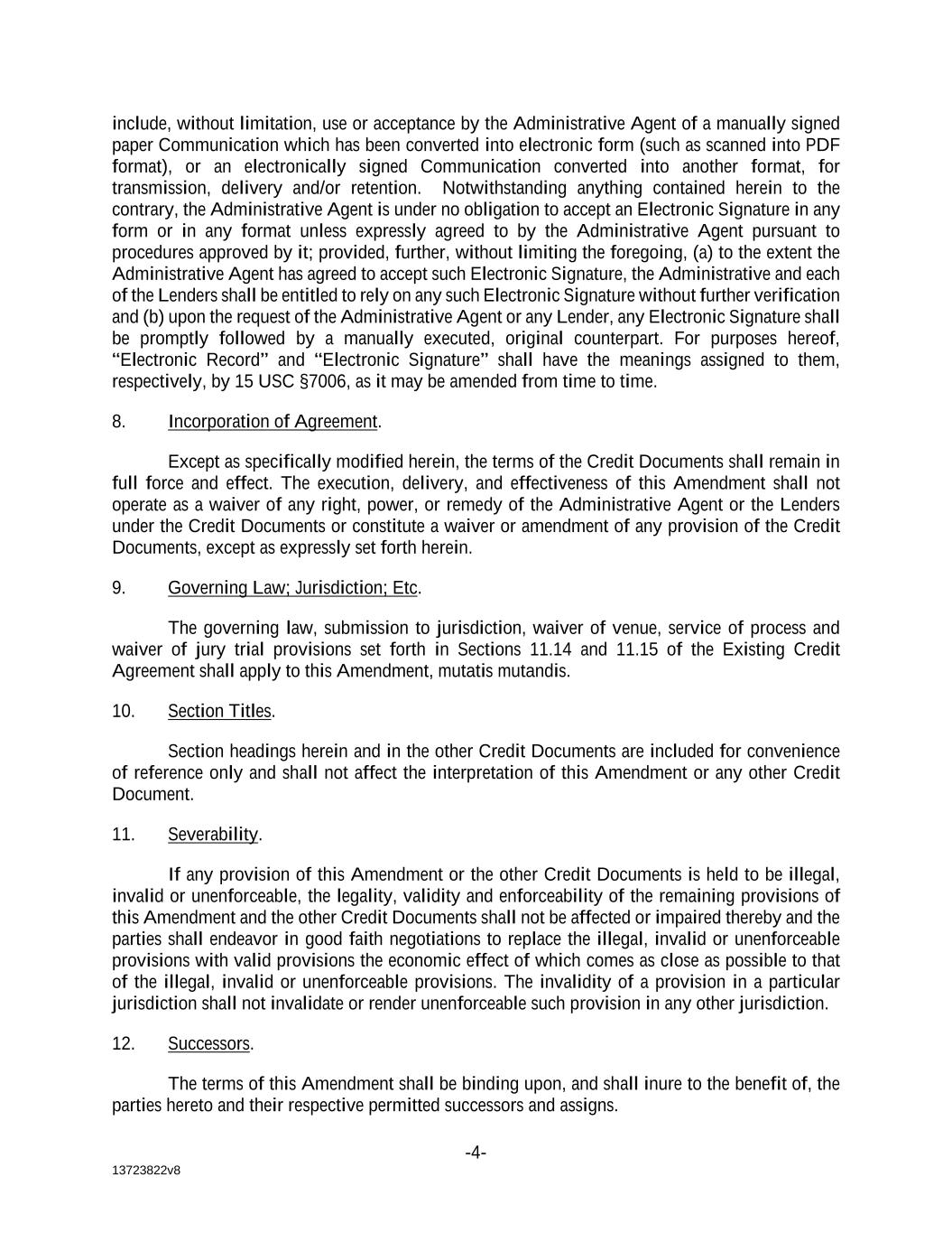 -4- 13723822v8 include, without limitation, use or acceptance by the Administrative Agent of a manually signed paper Communication which has been converted into electronic form (such as scanned into PDF format), or an electronically signed Communication converted into another format, for transmission, delivery and/or retention. Notwithstanding anything contained herein to the contrary, the Administrative Agent is under no obligation to accept an Electronic Signature in any form or in any format unless expressly agreed to by the Administrative Agent pursuant to procedures approved by it; provided, further, without limiting the foregoing, (a) to the extent the Administrative Agent has agreed to accept such Electronic Signature, the Administrative and each of the Lenders shall be entitled to rely on any such Electronic Signature without further verification and (b) upon the request of the Administrative Agent or any Lender, any Electronic Signature shall be promptly followed by a manually executed, original counterpart. For purposes hereof, “Electronic Record” and “Electronic Signature” shall have the meanings assigned to them, respectively, by 15 USC §7006, as it may be amended from time to time. 8. Incorporation of Agreement. Except as specifically modified herein, the terms of the Credit Documents shall remain in full force and effect. The execution, delivery, and effectiveness of this Amendment shall not operate as a waiver of any right, power, or remedy of the Administrative Agent or the Lenders under the Credit Documents or constitute a waiver or amendment of any provision of the Credit Documents, except as expressly set forth herein. 9. Governing Law; Jurisdiction; Etc. The governing law, submission to jurisdiction, waiver of venue, service of process and waiver of jury trial provisions set forth in Sections 11.14 and 11.15 of the Existing Credit Agreement shall apply to this Amendment, mutatis mutandis. 10. Section Titles. Section headings herein and in the other Credit Documents are included for convenience of reference only and shall not affect the interpretation of this Amendment or any other Credit Document. 11. Severability. If any provision of this Amendment or the other Credit Documents is held to be illegal, invalid or unenforceable, the legality, validity and enforceability of the remaining provisions of this Amendment and the other Credit Documents shall not be affected or impaired thereby and the parties shall endeavor in good faith negotiations to replace the illegal, invalid or unenforceable provisions with valid provisions the economic effect of which comes as close as possible to that of the illegal, invalid or unenforceable provisions. The invalidity of a provision in a particular jurisdiction shall not invalidate or render unenforceable such provision in any other jurisdiction. 12. Successors. The terms of this Amendment shall be binding upon, and shall inure to the benefit of, the parties hereto and their respective permitted successors and assigns.