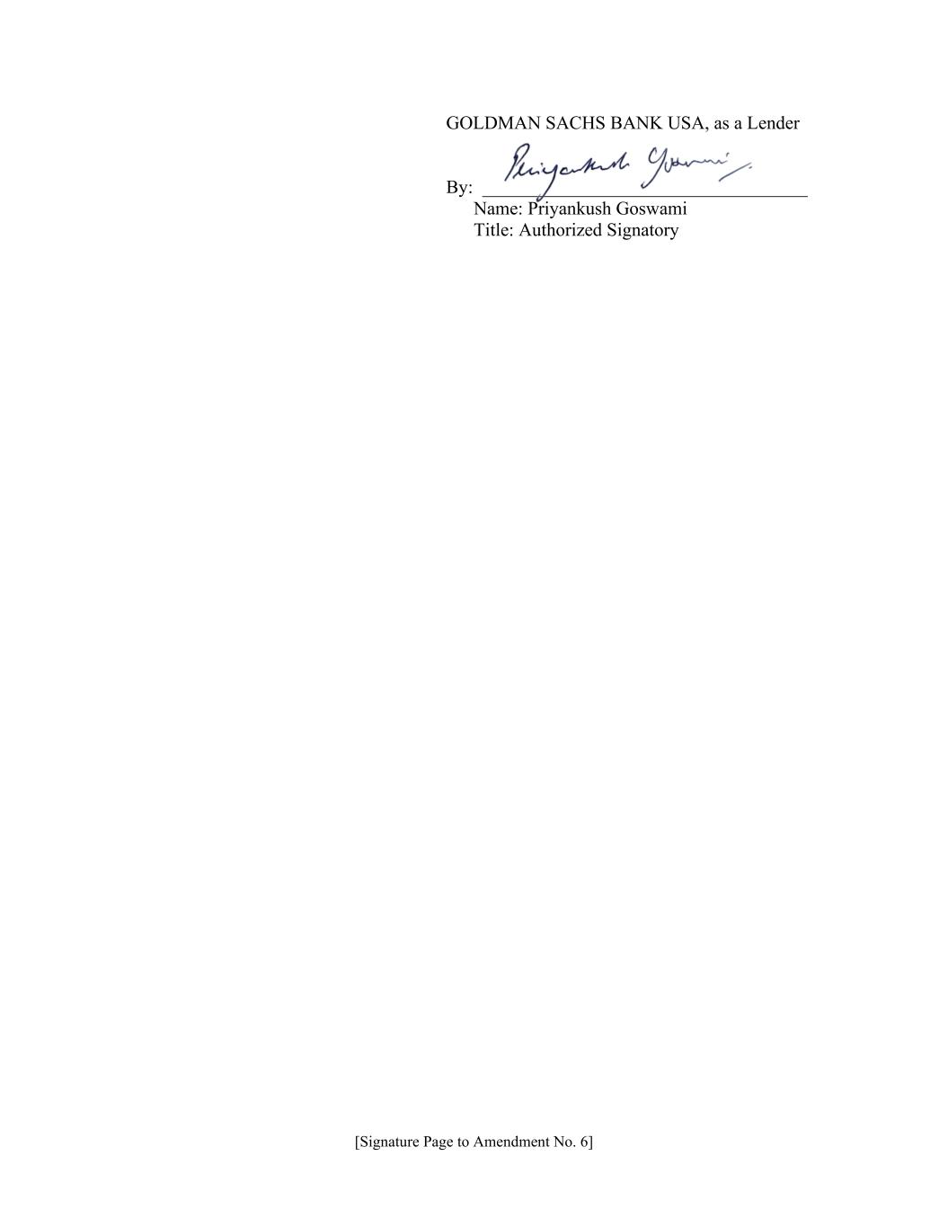 [Signature Page to Amendment No. 6] GOLDMAN SACHS BANK USA, as a Lender By: ___________________________________ Name: Priyankush Goswami Title: Authorized Signatory