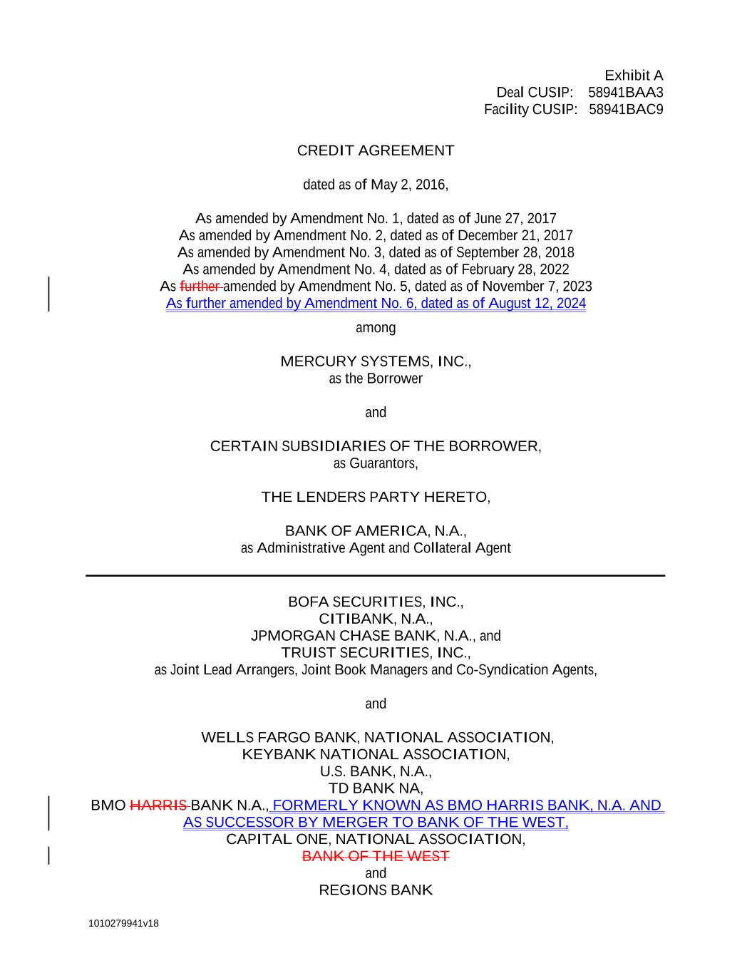 Exhibit A Deal CUSIP: 58941BAA3 Facility CUSIP: 58941BAC9 CREDIT AGREEMENT dated as of May 2, 2016, As amended by Amendment No. 1, dated as of June 27, 2017 As amended by Amendment No. 2, dated as of December 21, 2017 As amended by Amendment No. 3, dated as of September 28, 2018 As amended by Amendment No. 4, dated as of February 28, 2022 As further amended by Amendment No. 5, dated as of November 7, 2023 As further amended by Amendment No. 6, dated as of August 12, 2024 among MERCURY SYSTEMS, INC., as the Borrower and CERTAIN SUBSIDIARIES OF THE BORROWER, as Guarantors, THE LENDERS PARTY HERETO, BANK OF AMERICA, N.A., as Administrative Agent and Collateral Agent BOFA SECURITIES, INC., CITIBANK, N.A., JPMORGAN CHASE BANK, N.A., and TRUIST SECURITIES, INC., as Joint Lead Arrangers, Joint Book Managers and Co-Syndication Agents, and WELLS FARGO BANK, NATIONAL ASSOCIATION, KEYBANK NATIONAL ASSOCIATION, U.S. BANK, N.A., TD BANK NA, BMO HARRIS BANK N.A., FORMERLY KNOWN AS BMO HARRIS BANK, N.A. AND AS SUCCESSOR BY MERGER TO BANK OF THE WEST, CAPITAL ONE, NATIONAL ASSOCIATION, BANK OF THE WEST and REGIONS BANK 1010279941v18